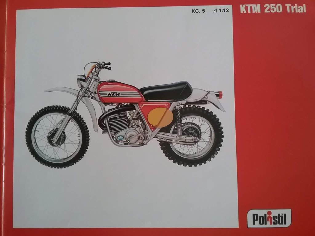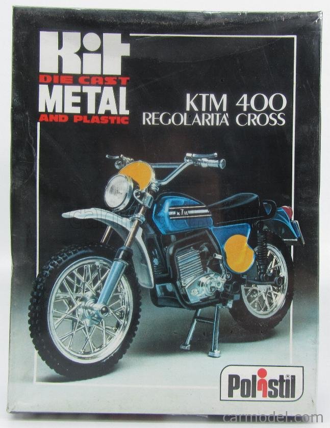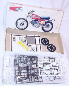 Questo modello, che si può benissimo considerare come unico, uscì verso il 1980 anche come kit, ma è nel 1978 che la Polistil produsse quello che è forse il modello di KTM più famoso e, forse, famigerato di tutti, ed è forse addirittura improprio dire che lo produsse: nella Serie Hobby dei kit in plastica, uscì, prodotta in non più di cento (c’è chi dice cinquanta) esemplari di preserie, una bellissima scatola di montaggio in scala 1:12, in plastica, del 250 GS del 1974, senza nessun punto di contatto con la produzione die-cast, ed ovviamente rarissimo da incontrare ai giorni nostri (chi scrive ne ha uno, ma avendolo riposto molto in alto al riparo da madri e colf ed essendosi molto rotto un malleolo, è costretto a propinarvi delle comunque rare foto recuperate da internet, chiedendovene venia).