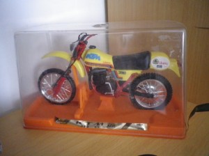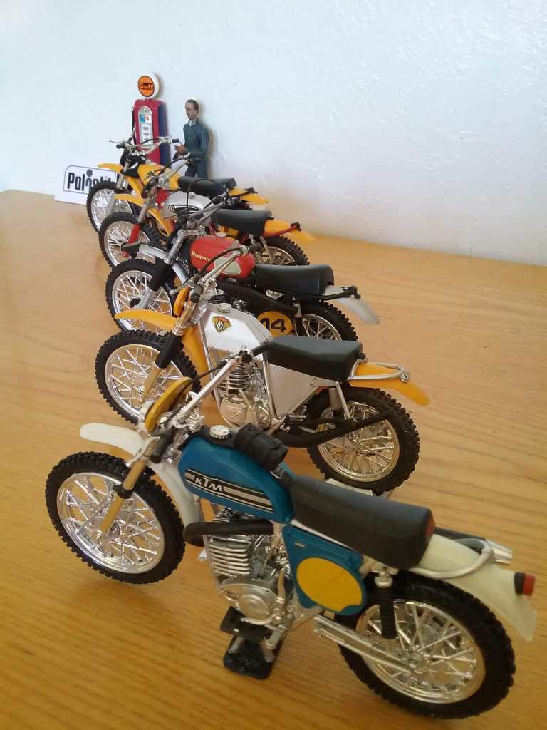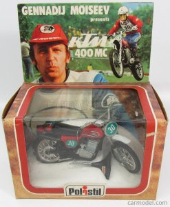 Altre ottime riproduzioni vennero dalla Polistil, che sfruttando una base comune fece sia la versione GS che MC del 400 in versione die-cast, in scala 1:12: l’MC era rosso e veniva proposto in una scatola molto scenografica con la fotografia di Moiseev al Motocross delle Nazioni (che si correva appunto con le 500 c.c.), mentre il GS era proposto in blu, come le moto della nazionale italiana, di cui l’azzurro è da sempre il colore d’elezione, alla Sei Giorni dell’Isola di Man 1975.