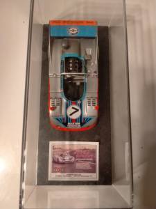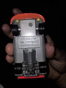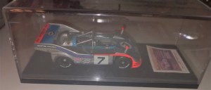 C’era dentro di tutto, letteralmente di tutto, montaggi di livello assoluto e factory built di livello ancora più altisonante, roba da museo del modello artigianale: casse e casse di Starter, Provence Moulage, anche AMR, DVA, Madyero, e… E ad un certo punto lei. Scrivo a David mandandogli la foto: “È ciò che penso che sia?” “Sì, prendila subito”. E fu così che la Porsche Story venne a casa con me, e divenne uno dei modelli che vado più orgoglioso di avere un collezione. Avendolo, però, sorge automatico il desiderio di analizzarlo, per capirne la genesi, le sinapsi di chi l’ha fatto, anche un po’ il profumo del modellismo e della Provenza dei tardi anni ’70. Cosa traspare “studiandola”? Premessa: studiarla va benissimo, ma con molta cautela, perché è conservata in maniera spaziale, però è fragilissima, e muoverla dalla sua teca mi trova sempre molto restio (infatti le foto del fondino le feci ad acquisto appena effettuato, non abbiatemene ma non la scollerò più da dove si trova), ma acquisita questa doverosa premessa non resta che dire che la derivazione dalla Porsche 917/10 Can Am della Solido è lampante: è stata certamente molto e molto bene rimaneggiata, ma la base è lei, e guardando i fondini la parentela si fa ineluttabile.