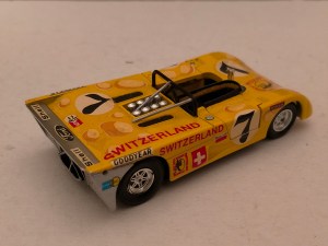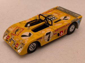Rispetto all’originale sono stati chiusi i fari, eliminate le parti posteriori dei parafanghi, modificati i retrovisori e il rollbar e, intervento piuttosto impegnativo, spostati gli sfoghi ad asola del cofano motore. Il giallo è diverso dalla Le Mans, probabilmente non ne trovai altro. Comunque non sono certo che il giallo fosse lo stesso nelle due gare, vista la presenza dello sponsor del formaggio a Le Mans, che avrebbe potuto richiedere un giallo più intenso.