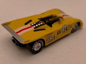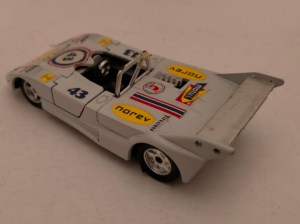 C’entra ancora meno, ma inserisco nel discorso l’ultima Lola di quella famiglia della mia collezione, la T294 n.813 del catalogo Norev del 1975, che riproduce la vettura sponsorizzata dalla Norev che si ritirò alla 24 ore di Le Mans del 1974. Da notare che, come nella precedente Chevron, le decals sono applicate tutte sulla parte superiore della scocca.