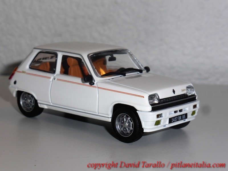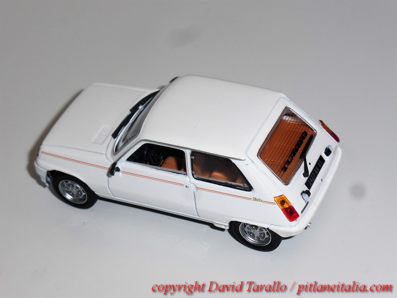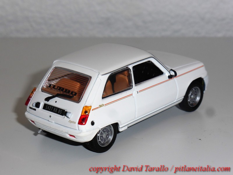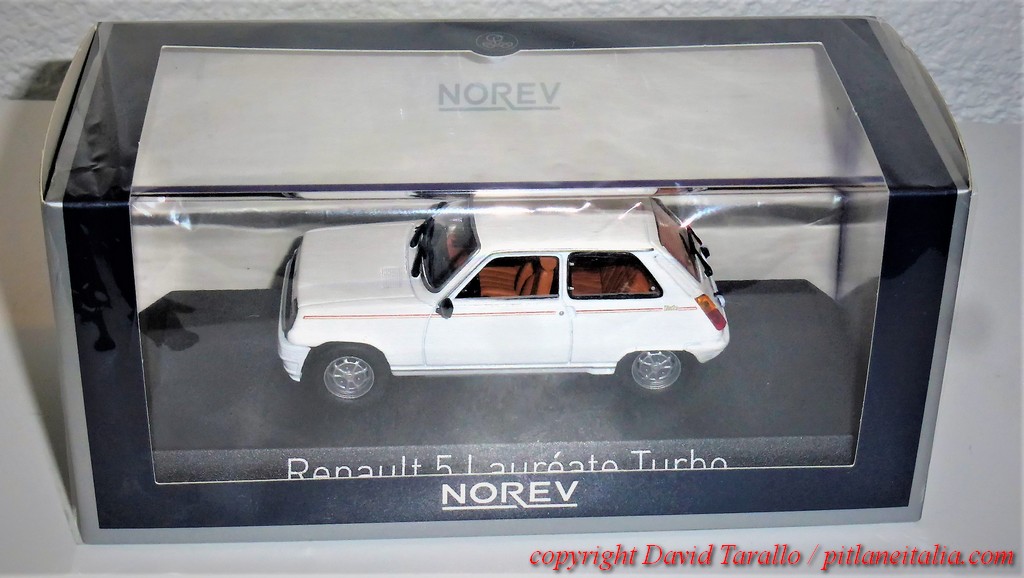 Sulla R5 Turbo Lauréate di Norev tutti i dettagli che distinguono questa versione sono stati correttamente trattati: i cerchi Fergat, i paraurti del colore della carrozzeria, gli interni beige, il volante sportivo a tre razze forate, le scritte e le decorazioni varie. Sotto questo aspetto, il principale elemento critico è la calandra, il cui listello superiore e la sottile griglia dovrebbero essere del colore della carrozzeria e non alluminio. Andrà bene quando Norev deciderà di riprodurre una vettura in argento! Gli specchietti retrovisori sono presenti su entrambi i lati, quando in realtà per la rete di distribuzione francese (l’immatricolazione sul modello riporta i numeri del dipartimento 85, corrispondente alla Vandea) lo specchietto era presente sul solo lato guidatore, caratteristica peraltro comune a quasi tutti i mercati europei dell’epoca.