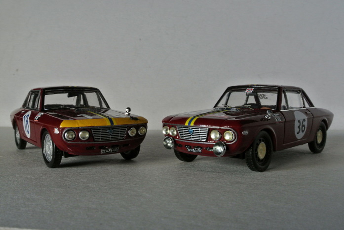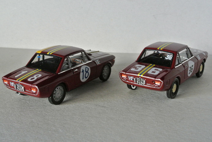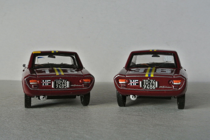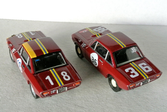In entrambi i modelli le decals sono state disegnate da Edoardo Gallini, ma i due 36 sui due cofani della Rally dei Fiori sono troppo grandi per colpa mia che diedi delle misure esagerate e Edoardo. Aggiunsi anche i fregi longitudinali sulla mezzeria del cofano motore e cambiai le luci della targa, entrambi i particolari sono stati preparati da Corrado Crivellaro.