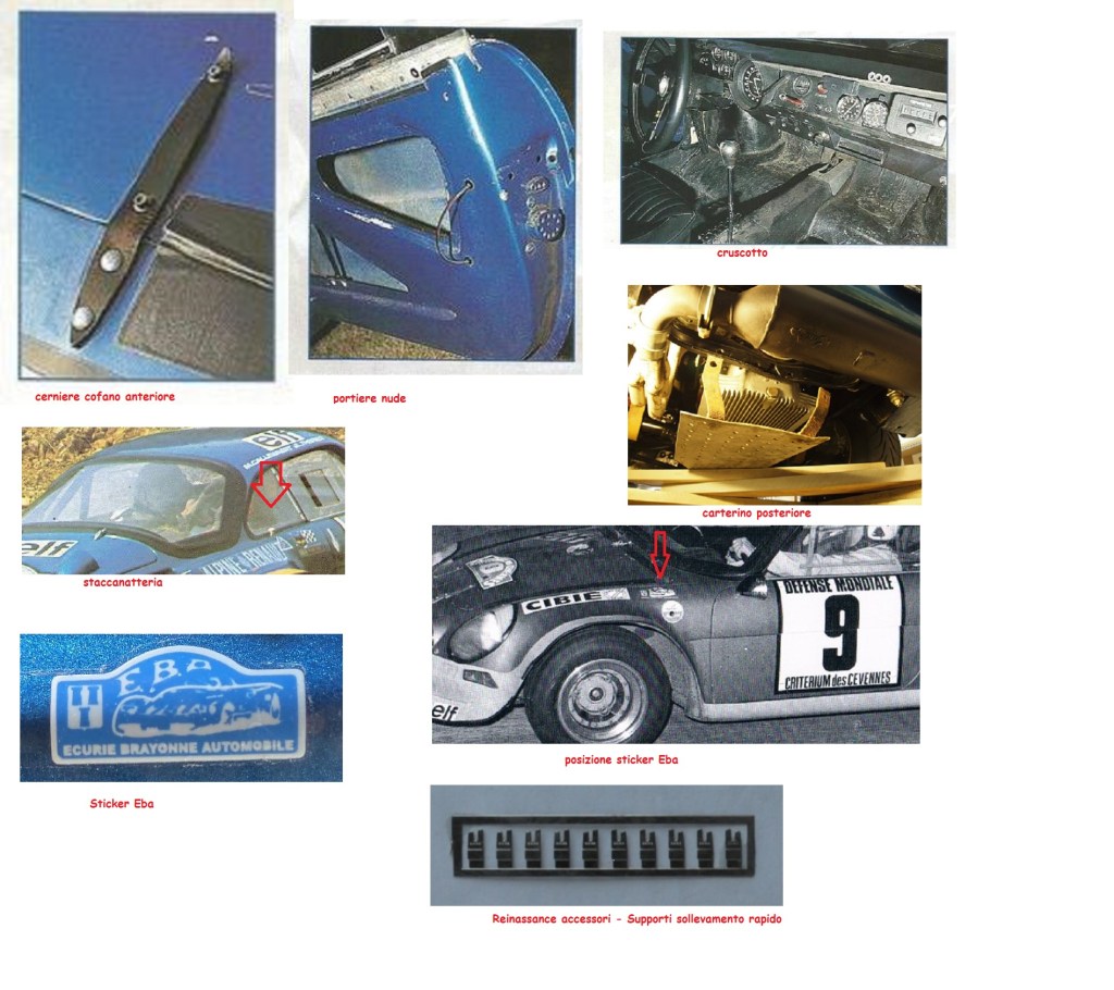 Esterno: Eliminare i fermi cofano anteriori e posteriori (che non c’erano) perché mi sembrano in scala 1/87 e sostituirli con nuovi fotoincisi; eliminare i due supporti del sollevatore rapido presenti sotto la coda, anche qui perché sembrano fuori scala e mal posizionati e sostituirli con nuovi fotoincisi (la Renaissance ne fa di bellissimi); manca lo staccabatteria presente nella realtà vicino al deflettore posteriore destro: bisogna crearlo e posizionarlo; mancano e bisogna crearli e posizionarli lo spruzzino centrale tergi (gliceur central, caratteristica delle Gr.4 ufficiali) e i due indicatori di direzione laterali (erano posizionati all’interno dello sticker Alpine, sul fianco); vanno eliminate (ridotti con cartavetro) le due cerniere del cofano anteriore ed applicate sopra due elementi fotoincisi (nella realtà le due cerniere erano sostituite per motivi di peso da due inserti di cuoio); manca la “scotchettatura” del cofano anteriore, che va fatta con decals; manca l’adesivo dell’E.B.A. (Ecurie Brayonne Automobile) di Jean-Luc Thérier, presente solo sul fianco sinistro subito dopo allo sticker Cibié, che era una caratteristica sempre presente sulle auto del pilota normanno in quel periodo. Infine i più bravi possono creare e posizionare un carterino di protezione alla coppa dell’olio (elemento solo disegnato a rilievo sull’elemento in resina del fondino), non presente sulla coda.