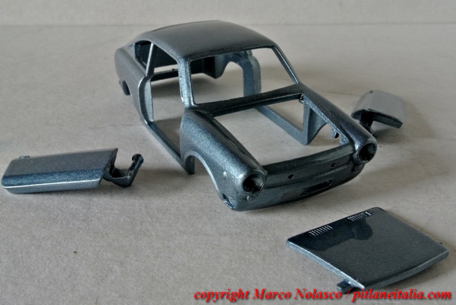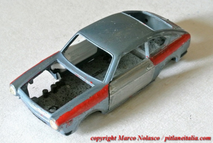 A questo punto mi procurai un paraurti anteriore e un fregio grazie alla rete e mi recai in un colorificio con il rottame ancora con la vernice originale, dove feci impazzire l’addetto, che per fortuna faceva modellismo e quindi aveva una idonea “forma mentis”, per ottenere una tinta la più fedele possibile.