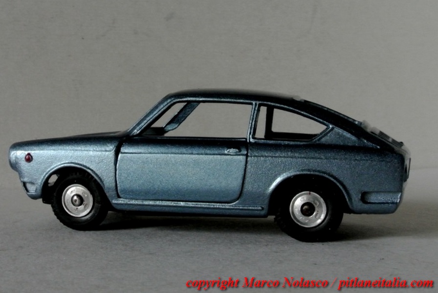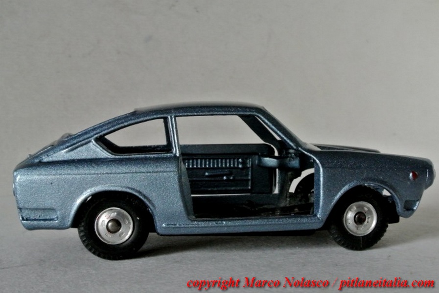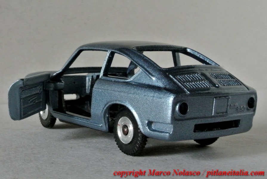 Io colleziono automodelli da sempre e non ho quasi mai venduto nulla, quindi ho ancora qualche obsoleto della mia infanzia e della mia adolescenza. Nella maggior parte dei casi ci giocavo con moderazione, quindi le loro condizioni sono rimaste in genere se non perfette buone, ma talvolta facevo dei veri propri scempi, come nel periodo in cui scoprii i rally, seconda metà degli anni ’60, e di conseguenza sfigurai molti modelli per ricavarne improbabili versioni corsaiole. Una delle malcapitate fu questa Fiat 850 coupé del 1965 della Politoys M, il n.517 uscito nel 1966.