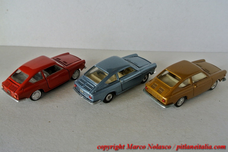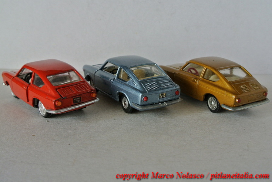 Nelle ultime immagini confronto le tre 850 coupé dell’epoca, il Politoys, la rossa Edil Toys e la Mercury color ocra, che però non ho ed è surrogata da una Seat 850 coupé Joal che dal Mercury deriva.