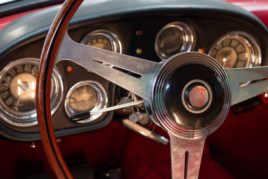 Grazie al Certificato di origine emesso dall’Heritage di Stellantis – Alfa Romeo Classiche, possiamo confermare che l’esemplare esposto, appartenente a un privato, è stato prodotto il 14 luglio 1956 e venduto 3 giorni dopo, a Parigi. La tinta blu è il suo colore originale e il motore installato oggi è ancora quello di primo equipaggiamento.