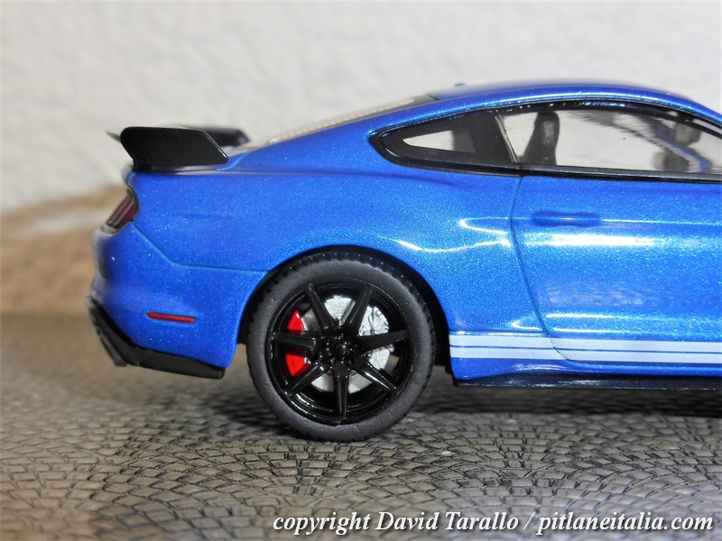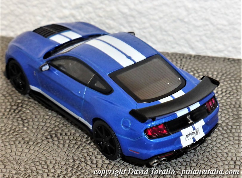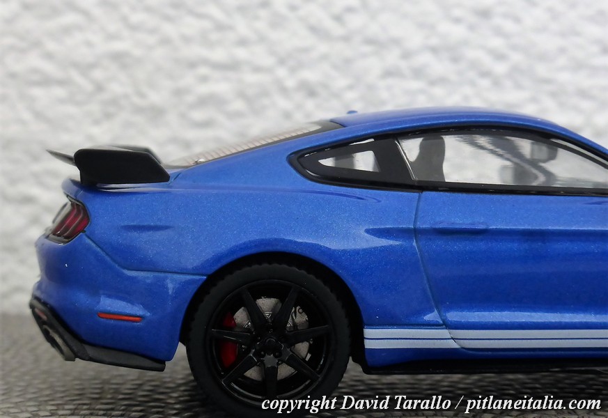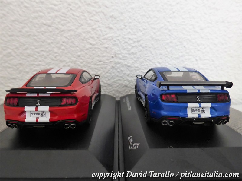 Sulla rossa si nota un leggero effetto di buccia d’arancia, ma nulla di particolarmente fastidioso, anche tenuto conto del prezzo. Come spesso accade nelle produzioni in serie, è possibile, col colore, cambiare anche qualche piccolo particolare e nel caso della Mustang GT500, Solido ha deciso di riprodurre lo spoiler posteriore in due diverse fogge: piatto quello della rossa, più avvolgente e con le paratie laterali quello della blu (vedere anche foto sotto).