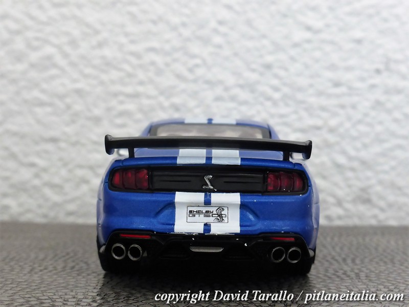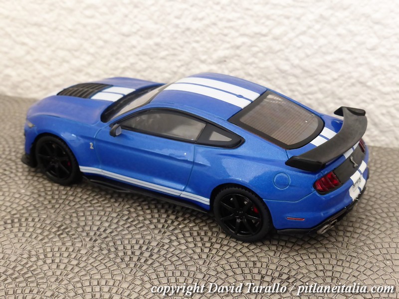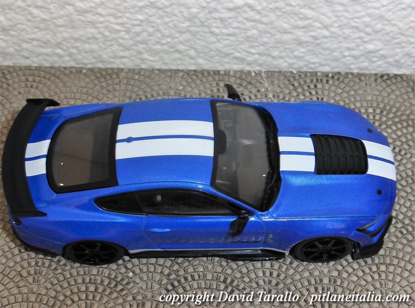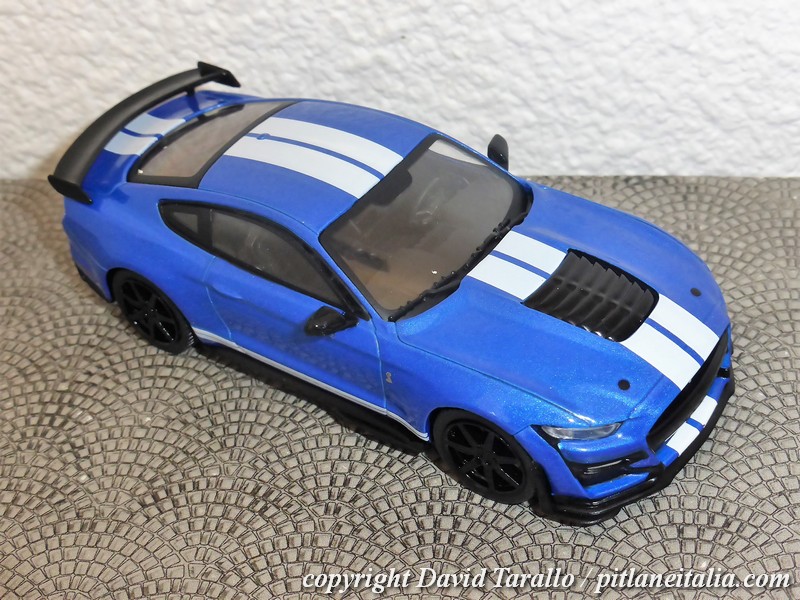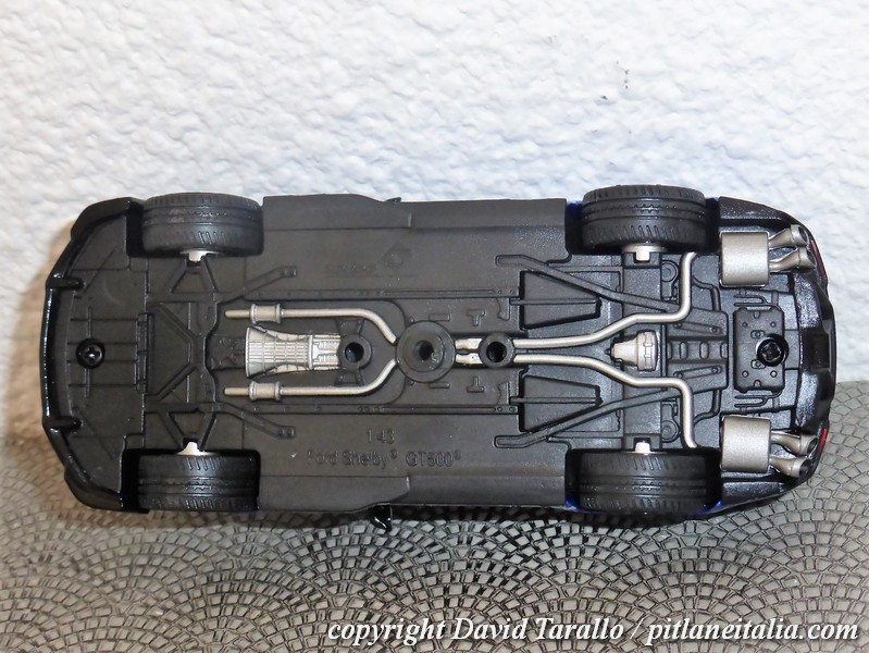 La decorazione delle strisce bianche è realizzata in decal, che non in tutti gli esemplari sono applicate col massimo della cura. Sulla nostra GT500 blu si nota bene ad esempio al posteriore la traccia di una decal stesa male e verosimilmente tolta per essere sostituita da un nuovo pezzo. Peccato che della prima decal sia rimasto un lembo incastrato fra carrozzeria e paraurti. Sarà abbastanza facile rimediare ma l’effetto iniziale era davvero brutto. I vetri sono in plastica e si inseriscono bene nelle loro sedi: si notano, come al solito, graffietti e varie appannature ma tutto sommato ci siamo, così come ci siamo a livello di montaggio: su tutto il modello non rileviamo tracce di colla né imprecisioni tali da compromettere l’aspetto generale.