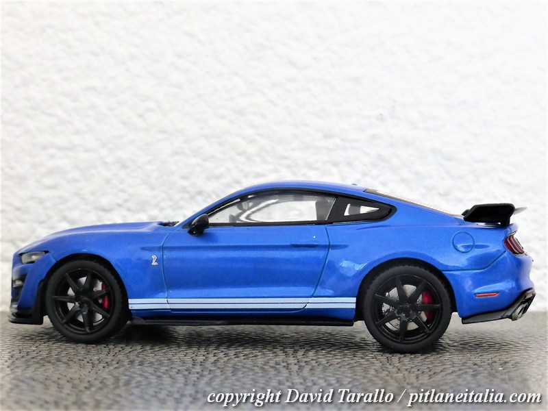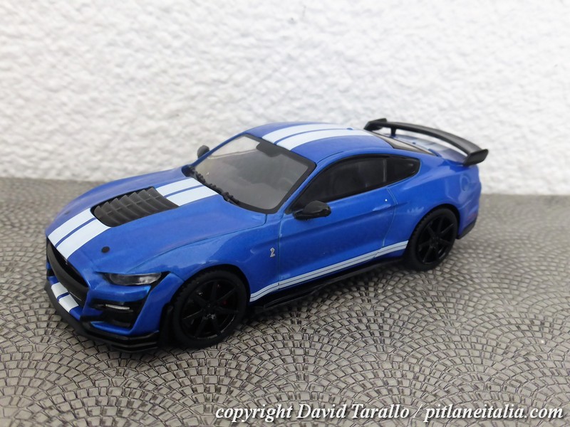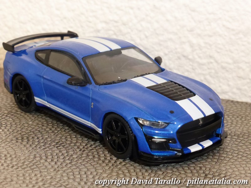 Detestando cordialmente nelle recensioni di modelli manfrine del tipo “se non vi bastano i cavalli della versione normale, ecco a voi i 771 della GT500″ e banalità varie, visto che chi sta dietro alle auto vere, e può permettersele, ben difficilmente passerà dieci minuti in un Leclerc a cercare un Solido da neanche 20 euro, passiamo al sodo. La Shelby GT500 è la versione top della Mustang. Il V8 da 5,2 litri sviluppa ben 771 cavalli a 7300 giri. La trazione è naturalmente posteriore e la trasmissione è robotizzata a 7 velocità. Il peso, per i pazzeschi standard odierni, è tutto sommato accettabile: 1892 kg di massa per un rapporto peso/potenza di 2,45kg/cv. La GT500 Shelby accelera da 0 a 100 km/h in tre secondi e mezzo. Per ottimizzare il comportamento, è disponibile un pacchetto Fast Track, che comprende molle più rigide, ammortizzatori intelligenti dal comportamento ancora più sportivo, alettone posteriore regolabile manualmente e cerchi da 20” in fibra di carbonio, più leggeri di 16 kg l’uno rispetto a quelli montati sulla GT500 standard.