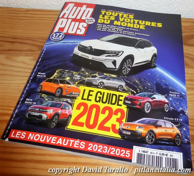 Se per qualsiasi ragione, professionale o meno, siete nel mondo dell’auto, questa guida edita dalla testata francese Auto Plus fa per voi. A nostro modesto avvisto la referenza in materia resta, almeno in Francia, Toutes les voitures du monde dell’Automobile Magazine che esce a primavera inoltrata, ma questo fascicolo di Auto Plus vi aiuterà molto nei mesi che vengono, per fare il punto sulla produzione e per reperire notizie che probabilmente si trovano tutte in rete, ma per riunire le quali ci vorrebbe molto più lavoro che consultare una pubblicazione ragionata. Con le sue 372 pagine, Toutes les voitures du monde – le guide 2023 fornisce in modo rapido e dettagliato tutti i dati tecnici delle vetture commercializzate in Francia (e quindi più o meno vi viene utile per la maggior parte del mercato europeo), quelle costruite da artigiani francesi e quelle non importate. In totale fanno trecento marchi per cinquantaquattro paesi.
