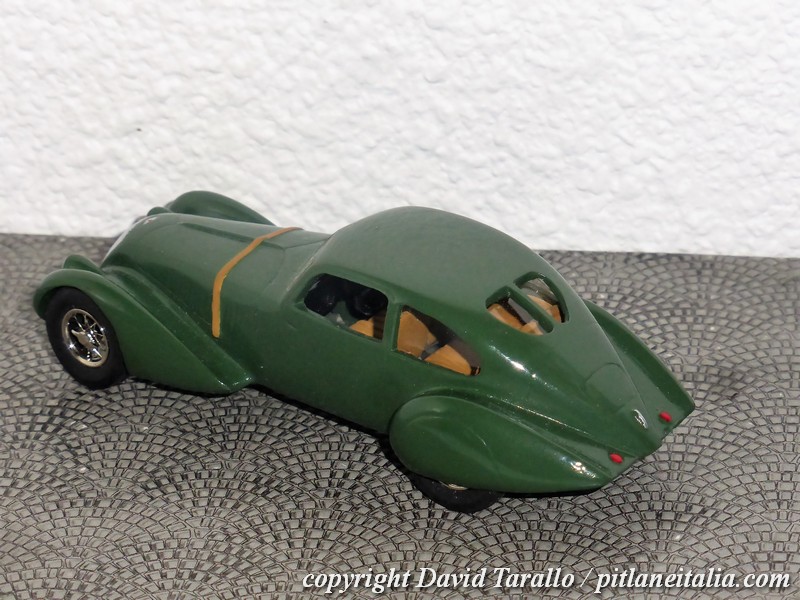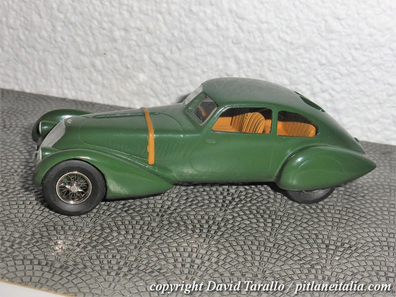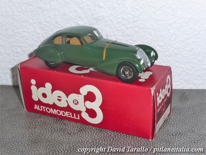 La maggior parte della produzione Idea3 era composta da kit ma una percentuale venne venduta a richiesta del collezionista come factory built, ed è esattamente il caso dell’esemplare in foto. La finitura era per quegli anni impeccabile: si nota una verniciatura liscia e lucida, probabilmente eseguita a bomboletta. Le ruote, ABC, sono di grande effetto, con i finissimi raggi e i gallettoni riportati, così come i pochi ma precisi tocchi di colore Humbrol o Molak a evidenziare i dettagli essenziali: la calandra, le luci, lo stemma anteriore e la cinghia fermacofano. Gli interni sono dipinti in marrone chiaro.