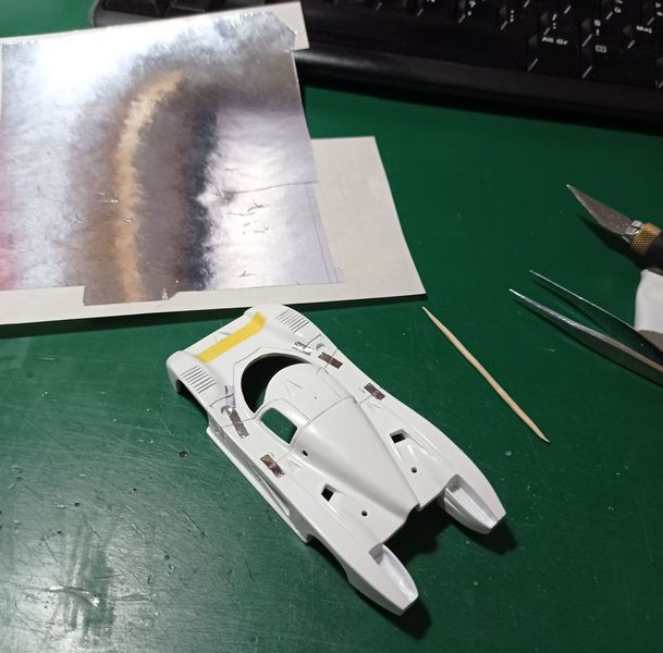 Così lui stesso ci descrive le fasi salienti della trasformazione: “Ho utilizzato i supporti dell’ala sinistra e destra della Lola T600 di Marsh Models che ho dovuto rielaborare per dar loro la giusta forma, così come i due supporti centrali sotto l’ala. Ho acquistato una lamina di alpacca spessa 0,10mm, per realizzare la pinna che ho formato attorno a un filo armonico; questa rimane la parte più complicata dell’assemblaggio”.