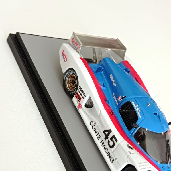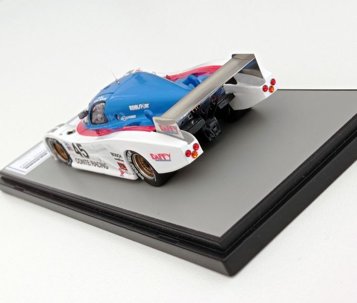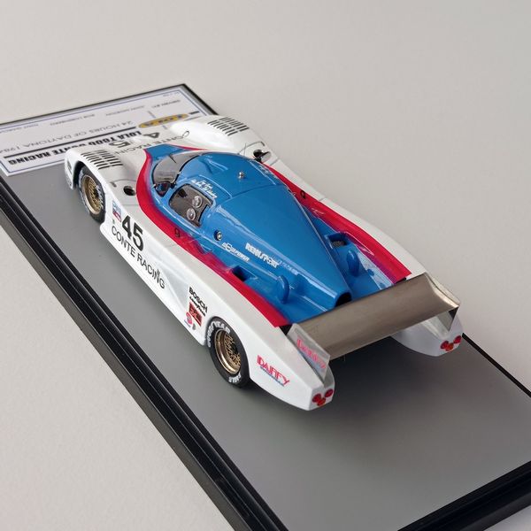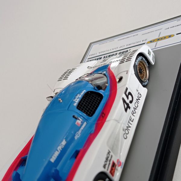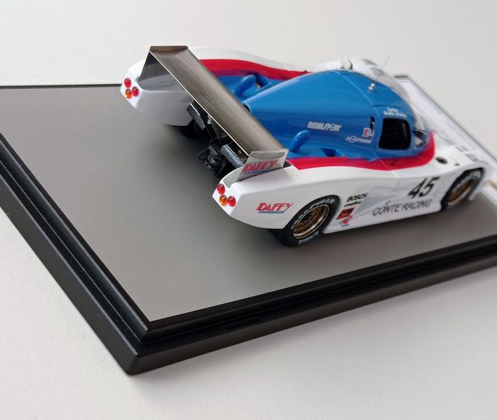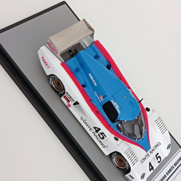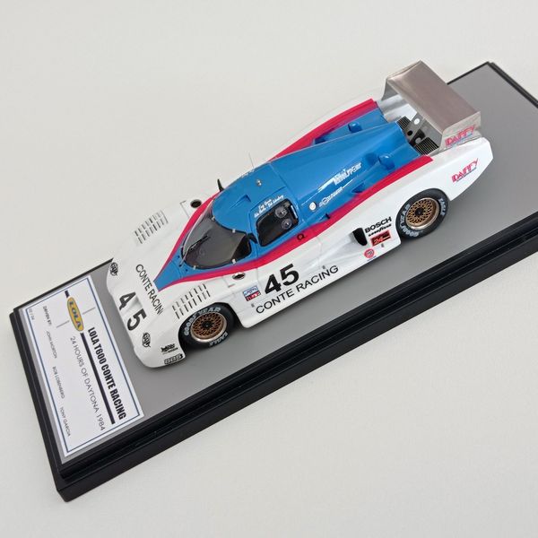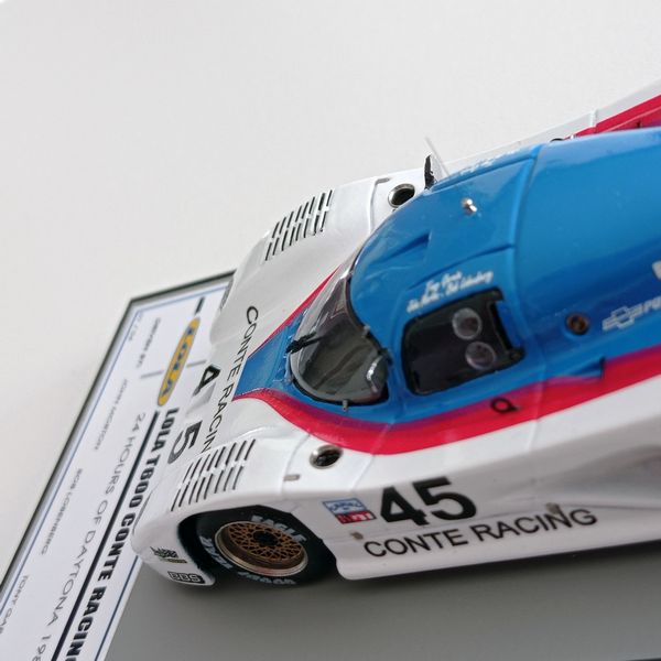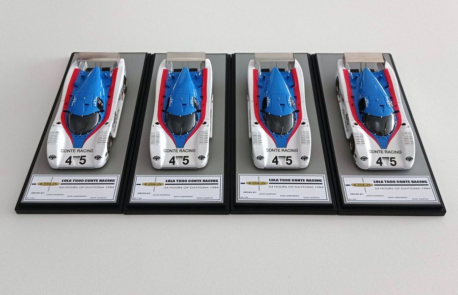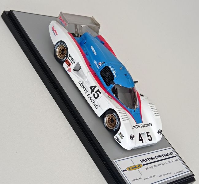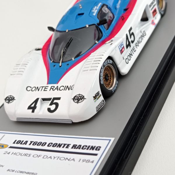 In questa sede ci occupiamo della realizzazione più recente, la Lola motorizzata Chevrolet T600 del Conte Racing così come corse alla 24 Ore di Daytona del 1984. La vettura, telaio HU11, disputò due stagioni IMSA col Conte Racing, dal 1983 al 1984, rivelandosi piuttosto competitiva e conquistando piazzamenti di rilievo. Fu seconda alla 3 Ore di Sears Point e alla 3 Ore di Portland del 1983. Alla 24 Ore di Daytona del 1984, gara di apertura della stagione IMSA, la T600 del Conte Racing, pilotata da John Morton, Bob Lobenberg e Tony Garcia, terminò all’11° posto, dopo aver fatto segnare il 10° tempo in prova. Ancora meglio fece la T600 Conte a Sebring (7° posto) e nelle gare successive arrivò a sfiorare il podio con un quarto posto a Riverside, concludendo spesso fra i primi cinque-sei. Nelle due foto sotto si noteranno alcuni particolari che come spesso accade non coincidono esattamente con la configurazione scelta per il modello, ma questo lo sanno bene soprattutto gli appassionati di gare di durata, che tra una cosa e l’altra durano una settimana.