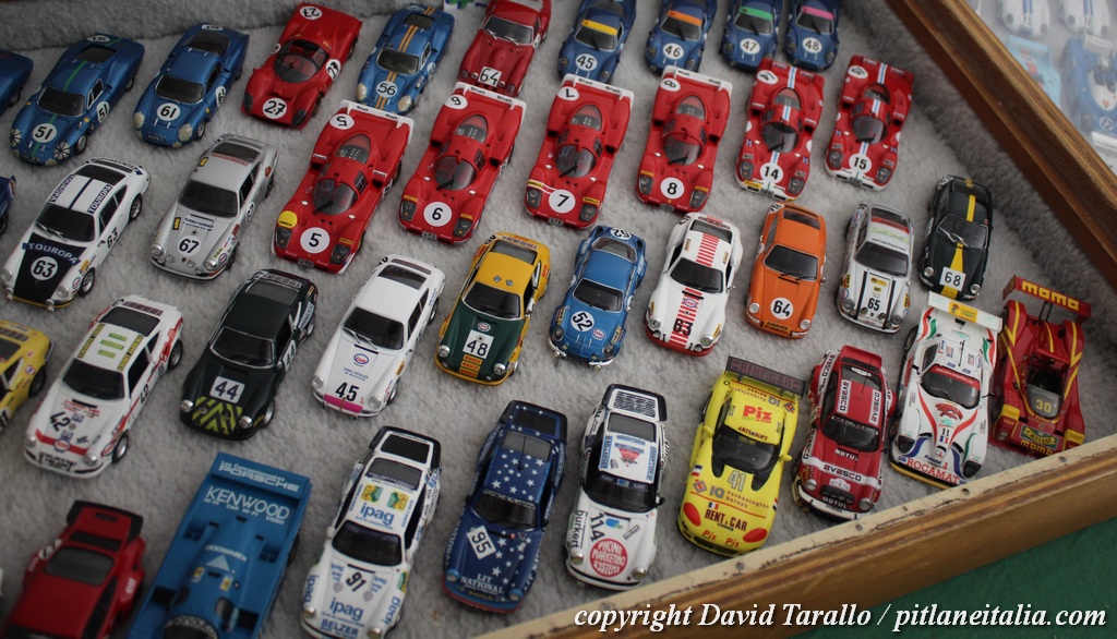I soggetti che Bruno predilige sono le Porsche 911 e le Ferrari Daytona: dalla Carrera RS si possono ricavare abbastanza facilmente anche le 911S larghe, eliminando la coda d’anatra e fresando i paraurti. Gli schieramenti delle Daytona non possono non ricordare i gruppi pubblicati nel TSSK nei primissimi anni ottanta, con tutti i modelli elaborati utilizzando le decals distribuite dalla BAM. A proposito di decals, Bruno può contare su diverse fonti, dai foglietti d’epoca a produzioni più recenti. I modelli ricevono una mano di trasparente automobilistico che, piaccia o no, li rende facilmente “manipolabili” e protegge le decorazioni che in molti casi sarebbero destinate a staccarsi o a screpolarsi. Ormai il Nostro si è costruito una cerchia di affezionati clienti che continuano a commissionargli modelli. “La prima volta che sono stato a Le Mans da venditore fu nel 1988”, ricorda, “e via via negli anni l’attività è andata crescendo, non solo con le elaborazioni ma anche con i montaggi e le elaborazioni di kit, scegliendo spesso soggetti poco conosciuti. All’inizio costruivo modelli per la mia collezione, poi ho visto che di gente interessata ce n’era”. Neanche l’avvento dei resincast ha placato gli appetiti dei collezionisti. “Mi sono detto: deciderà il mercato se e quando dovrò essere considerato un has-been oppure no”.