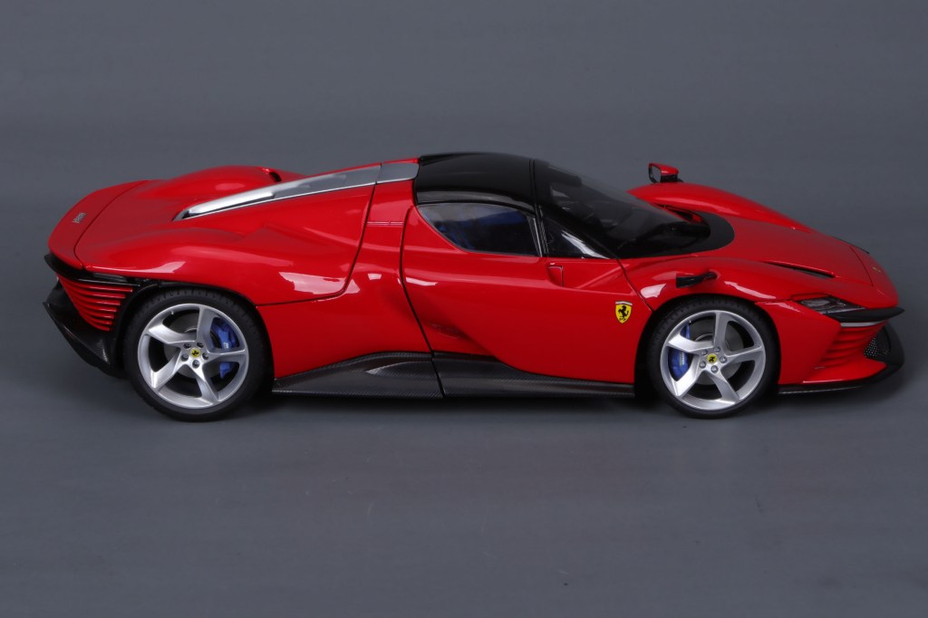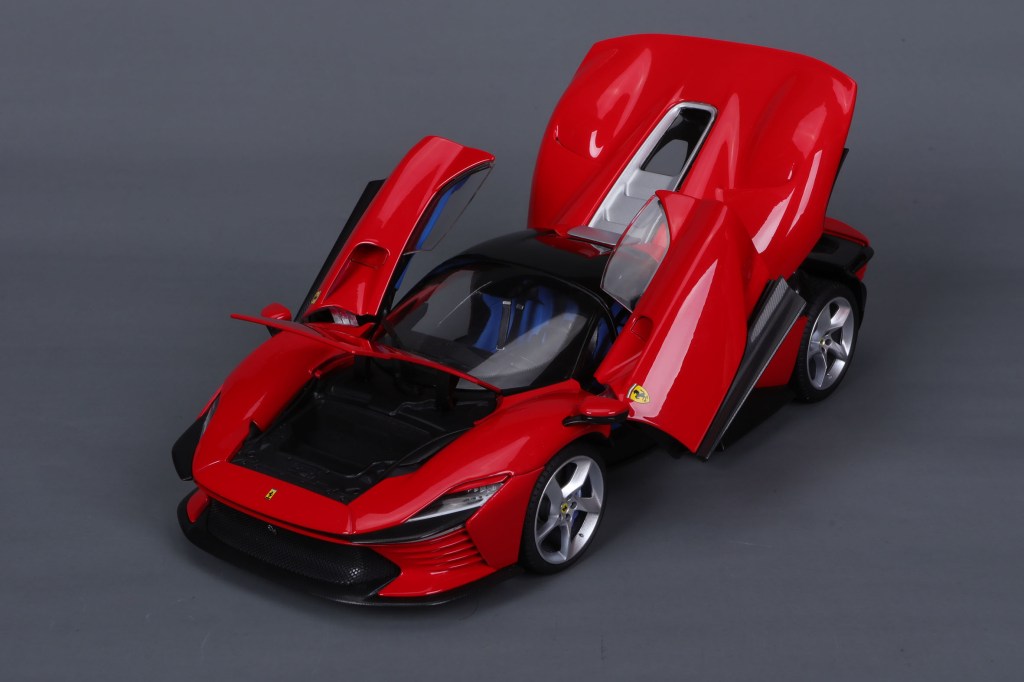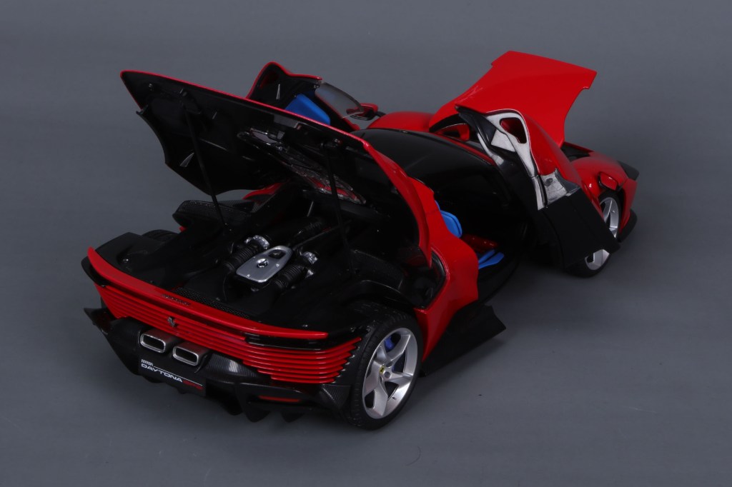 Questo è il primo prototipo della nuova Ferrari Daytona SP3. Le configurazioni dei modelli finiti saranno leggermente diverse, con le pinze dei freni gialle e gli interni beige per la versione chiusa di colore Rosso corsa 322 (colore del modello ritratto in queste immagini) mentre la versione aperta sarà di colore Rosso magna metallizzato con interni celesti (visibile a questo link: https://pitlaneitalia.com/2023/03/17/bburago-carmodel-la-ferrari-daytona-sp3-aperta-in-scala-118/).