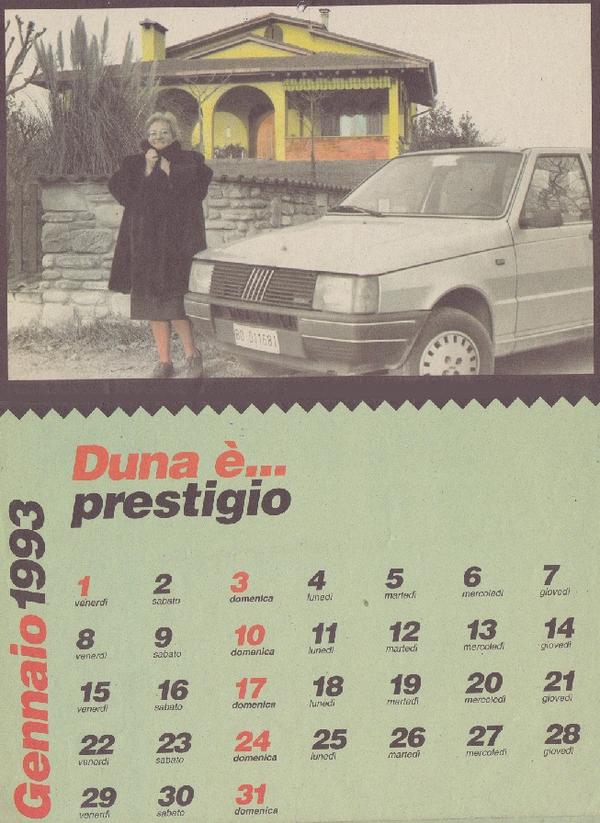 “Duna è…” fu il calendario di Cuore per il 1993, in cui la famigerata Uno con la coda (in questo caso in versione Weekend) appariva nei panni della dubbia “vamp” assieme ad una modella in carne ed ossa, una arzilla vecchietta tutta imbacuccata, e per ogni mese l’ambientazione cambiava, passando da “Duna è… praticità “, a tante altre pose, smaccatamente goliardiche ed esilaranti.