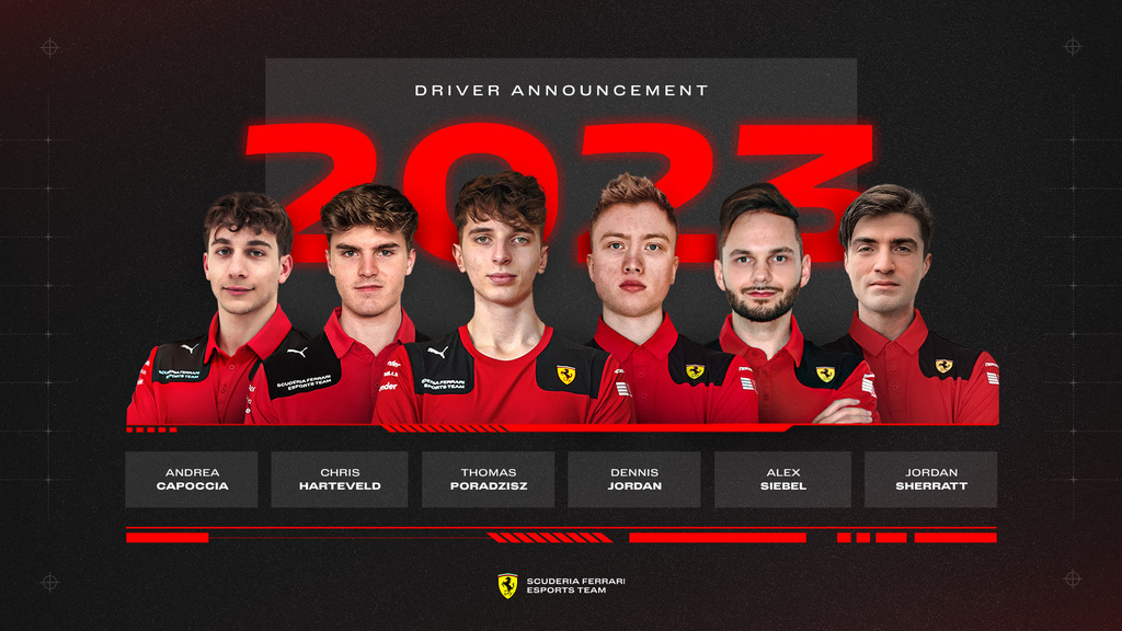 SRO Esports. Quattro i piloti impegnati nei campionati della galassia SRO Esports sulla piattaforma di Assetto Corsa Competizione con la nuovissima Ferrari 296 GT3: si tratta di Jonathan Riley, britannico classe 2003, fresco vincitore della Ferrari Esports Series 2022 già annunciato insieme a Longuet e Broumand; di Jordan Sherratt, sudafricano nato nel 1999 vincitore della SimGrid World Cup 2020, della Raceface Endurance Series 2021 e quinto nel campionato GT World Challenge Sprint 2022; di Chris Harteveld, olandese del 2001, vincitore in classe Silver del GT World Challenge America 2022, e di Andrea Capoccia, italiano classe 1997 trionfatore nel 2021 del campionato SimGrid Endurance. Tutti saranno impegnati nelle gare del campionato Intercontinental GT Challenge Esports (questo il calendario: 20/5 12 Ore di Bathurst; 17/6 9 Ore di Kyalami; 15/9 24 Ore di Spa-Francorchamps; 19/8 10 Ore di Suzuka; 16/9 8 Ore di Indianapolis), mentre Harteveld e Sherratt saranno anche protagonisti della SRO Esports Sim Pro Series (gare in presenza con questo calendario: 23/4 Monza; 3/6 Paul Ricard; 30/6 Spa-Francorchamps; 29/7 Nürburgring; 30/9 Barcellona). Jordan sarà lo stakanovista del gruppo dal momento che sarà impegnato anche nella SRO America Sprint Series (6/5 Laguna Seca; 10/6 Circuit of the Americas; 22/7 Silverstone; 5/8 Watkins Glen; 2/9 Indianapolis).