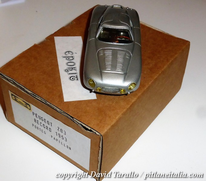 Un paio di anni fa Vincent Espinasse di Autojaune Paris mise in vendita una bella collezione di modelli di vetture da record, fra cui si trovavano diversi pezzi piuttosto rari di marchi ormai dimenticati, soprattutto inglesi, francesi, italiani e americani. Ebbi la possibilità di acquisire due Peugeot 203 Darl’mat prodotte da Epokit, nelle due versioni conosciute, con portiere standard e “papillon”.