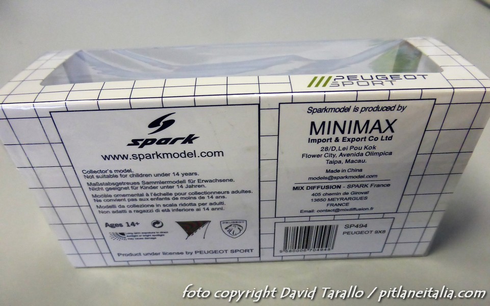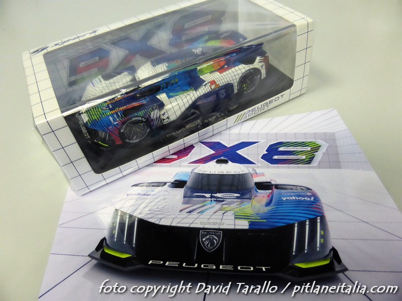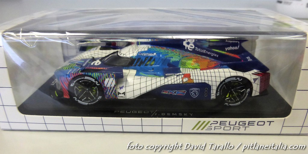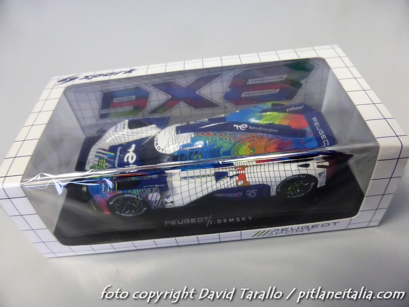 La Peugeot 9X8 Hypercar non vincerà magari in pista ma è comunque un oggetto di grande interesse, anche in termini modellistici. La versione decorata da J.Demsky che debutta in questi giorni alla 24 Ore di Le Mans è già disponibile come modello promozionale 1:43 prodotto da Spark. Come accadde l’anno scorso con la 9X8 standard, il modello viene venduto nella boutique Peugeot nel villaggio di Le Mans, e anche nel punto vendita di Spark. Questa edizione, senza numeri di gara, è caratterizzata dalla scatola che riprende alcuni spunti cromatici della vettura. Il numero di catalogo è SP494. Si tratta quindi di una serie speciale, anche se non numerata, diversa da quella che uscirà poi nella gamma standard di Spark. Col modello viene consegnata una cartolina ufficiale che fa da perfetto pendant con la miniatura.