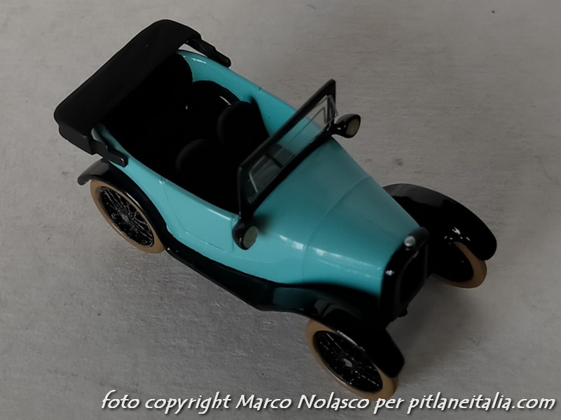 Visto che su PLIT compaiono spesso articoli sulle origini dei modelli speciali ti mando qualche foto di un modello che montai cinquanta anni fa, nel caso volessi prima o poi occuparti di questo marchio. Si tratta di un D.G., alias Dave Gilbert, uno dei pionieri dei kit in metallo bianco inglesi. Riproduce una Austin Seven Tourer del 1922. Non so molto di questa firma, se non che produsse due piccole serie di modelli, una “normale” e una più originale formata da modelli in stile Dinky Toys anteguerra. Mi risulta anche che Gilbert, come anche Barry Lester di Auto Replicas, fosse stato uno dei collaboratori di John Day, che lasciò a fine 1971 per mettersi in proprio. Questo kit è mio dal maggio 1973, ma dovrebbe risalire al 1972. E’ semplice, come del resto la vettura vera, ma la fusione è molto fine per l ‘epoca. Tutti i particolari sono in metallo, anche le gomme, eccetto il parabrezza che aggiunsi io.