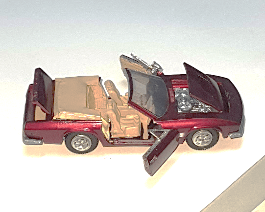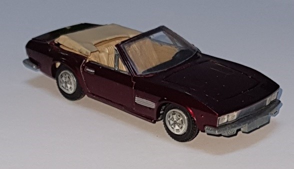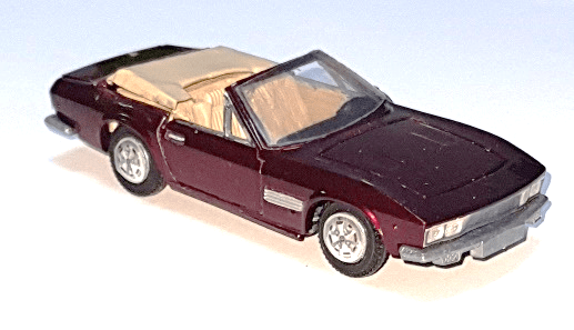 Piuttosto preciso ma “giocattoloso”, come erano i die-cast degli anni ’70: una bella Monteverdi 375L di colore amaranto, con finiture cromate (e “ruote veloci”).