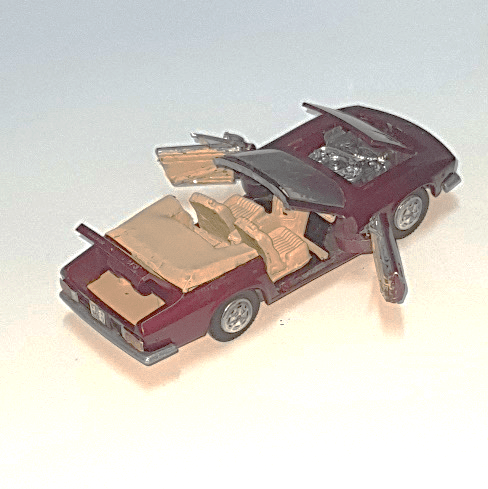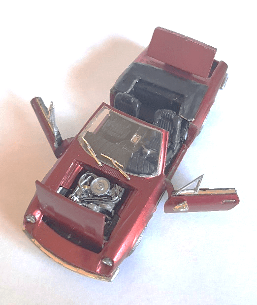 Volutamente ho lasciato che il modellino conservasse l’aspetto che ho definito “giocattoloso”, senza indulgere in fotoincisioni per volante, tergicristalli e ruote a raggi; ho lasciato perfino il grande specchietto retrovisore esterno, a memoria del coupè Dinky da cui deriva… ed ovviamente ho lasciato anche tutte le parti apribili, ritoccando solo le portiere, i due cofani e i deflettori (ora dotati di vetro).