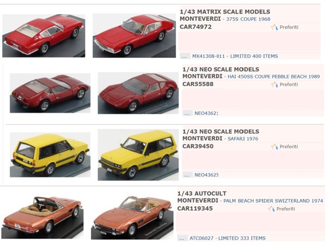 Qui sootto riporto un elenco dei modelli delle Monteverdi (ottenuto enucleando le diverse colorazioni) preso dal sito Car Model, in cui sono riportate anche succinte ma esaustive descrizioni delle varie vetture ad opera di David Tarallo.