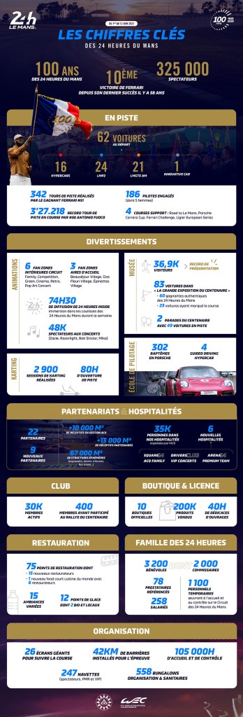 L’edizione 2023 della 24 Ore di Le Mans è stata quella dei numeri di grande impatto, a iniziare da quello degli spettatori, circa 325.000, record di tutti i tempi. Ma la gara del centenario ha segnato diversi altri risultati numerici sorprendenti, e l’ACO si è divertita a riassumerne alcune nell’infografica che vi proponiamo. L’appuntamento con la 24 Ore 2024 è fissato per il 15-16 giugno.