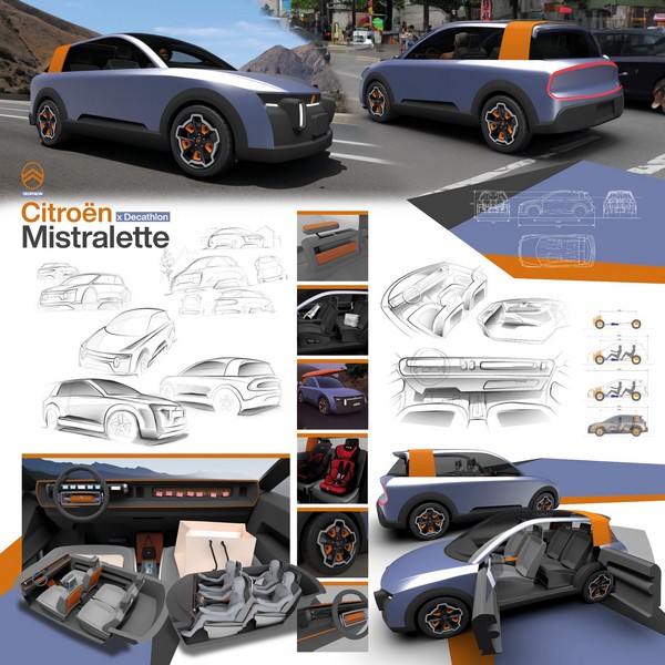 Versatile ed efficiente veicolo full-hybrid compatto, dedicato al marchio Citroën. In un ipotetico co-marketing tutto francese con Decathlon, si presta al trasporto di attrezzature sportive. Ha una grande spaziosità interna in stile open space. E’ pensato soprattutto per una clientela femminile, con un design “fresco”, che si rispecchia nella scelta dei colori e dei materiali, abbinando tinte sgargianti come l’arancione e il verde, a finiture glossy e opache. Ha la guida assistita.