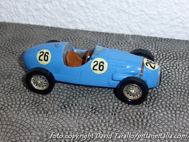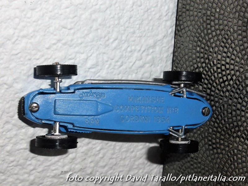 Il disegno che compare come posadecals ricorda moltissimo l’unica immagine a colori nota di questa vettura, che i Richardson avevano dovuto ritrovare in qualcuno dei non numerosi libri dell’epoca. Le ruote sono in metallo nichelato, e accolgono le abituali gomme in materiale plastico-gommoso che erano tutt’altro che facili da adattare e da rendere un minimo realistiche.