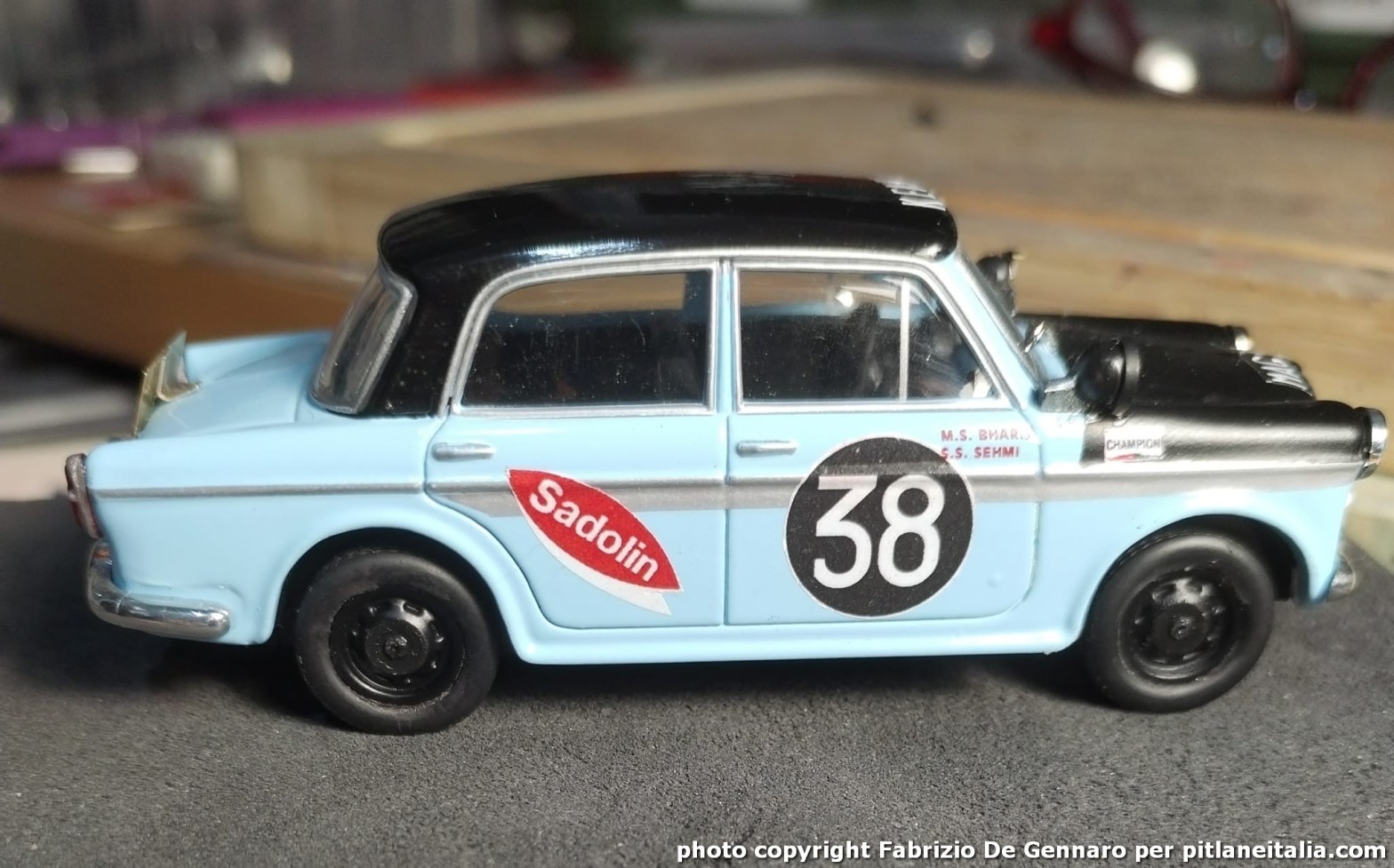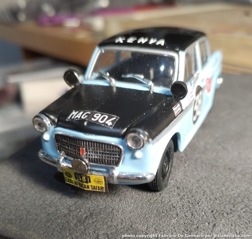 Fra le elaborazioni più recenti eseguite da Fabrizio De Gennaro vi è una curiosa Fiat 1200 in versione rally. Si tratta della vettura dell’equipaggio kenyota Bharij/Sehmi all’Eeast African Safari del 1963. La base dell’elaborazione è il diecast Starline in 1:43, le decals sono state stampate artigianalmente e vi è poi tutto l’armamentario di piccoli dettagli e accessori riciclati e/o autocostruiti. Un’elaborazione nel puro spirito “ludico” ma non senza quel rigore storico e quella precisione che caratterizzano le realizzazioni di Fabrizio.