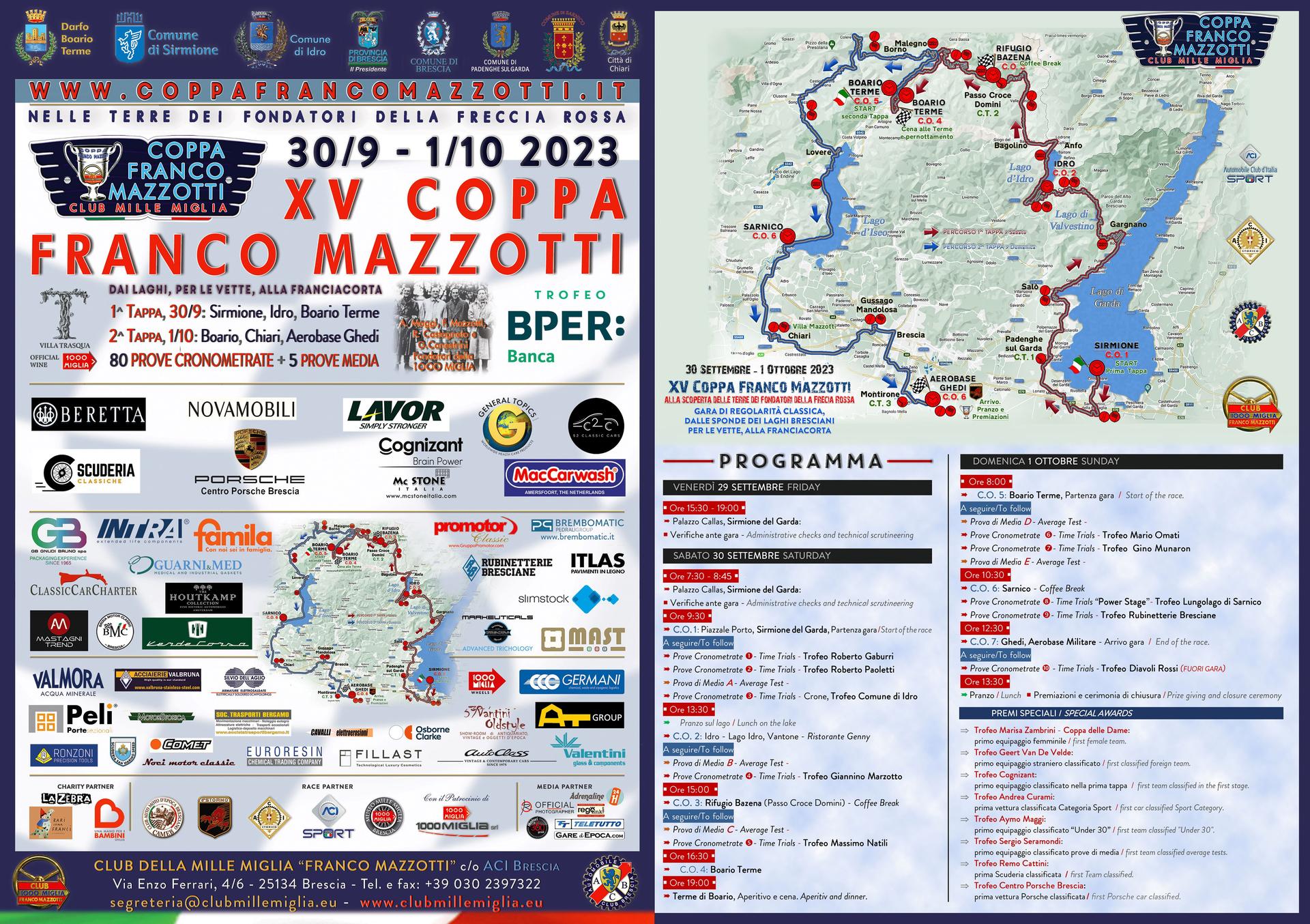 Sabato 30 settembre e domenica 1 ottobre si svolgerà la quindicesima edizione della Coppa Franco Mazzotti, gara di regolarità Superclassica ACI Sport, organizzata dal Club della Mille Miglia “Franco Mazzotti” in collaborazione con l’Automobile Club di Brescia e con il patrocinio di 1000 Miglia srl.