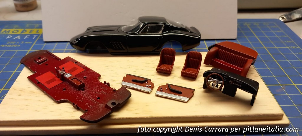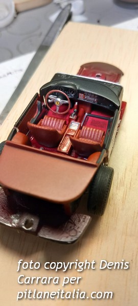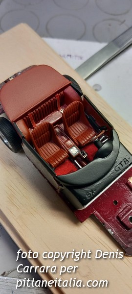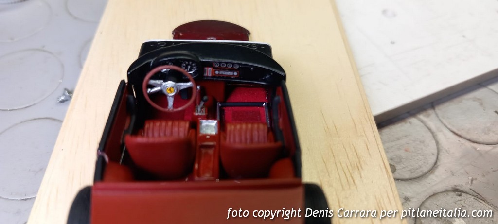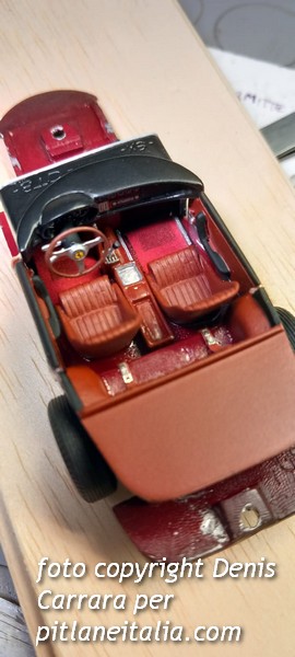 La scelta cromatica è stata mia. Tutto il resto è merito di Denis! Per quanto riguarda la cappelliera credo sia stata verniciata a spruzzo, mentre per riprodurre in generale i tappetini esistono tessuti specifici che si trovano sul mercato.