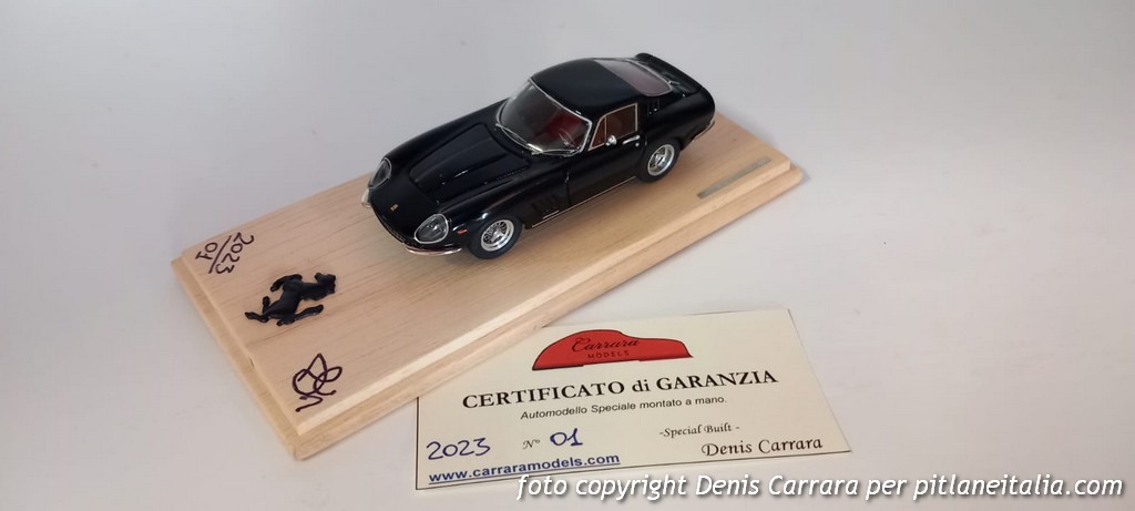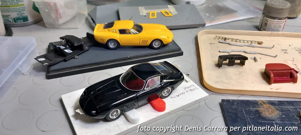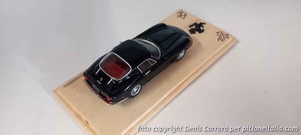 I cerchi in lega del kit sono stati sostituiti da ruote a raggi Remember (art. W14) con gallettoni in alluminio. Si sono dettagliati gli interni con l’aggiunta di moquette e altri particolari come il poggiapiedi lato passeggero; il cruscotto è stato rivisto e reso più realistico. Esternamente, sono stati cambiati i gruppi ottici posteriori (ora in plastica trasparente verniciata con supporto cromato), il logo laterale Pininfarina, di dimensioni più corrette rispetto al foglietto Tron, e tutto è stato rifinito e registrato al meglio. Notare le cinghie per i bagagli sui sedili posteriori. Le due cerniere del bagagliaio sono state ricostruite in metallo. La 275 GTB di Tron non era certo facile da far stare insieme: l’assetto già poneva problemi con le ruote originarie e ottenere un risultato finale convincente è stata impresa abbastanza complicata. Anche la sistemazione dei vetri, delle calotte di protezione dei fari con relativa ghiera ha richiesto non pochi sforzi.