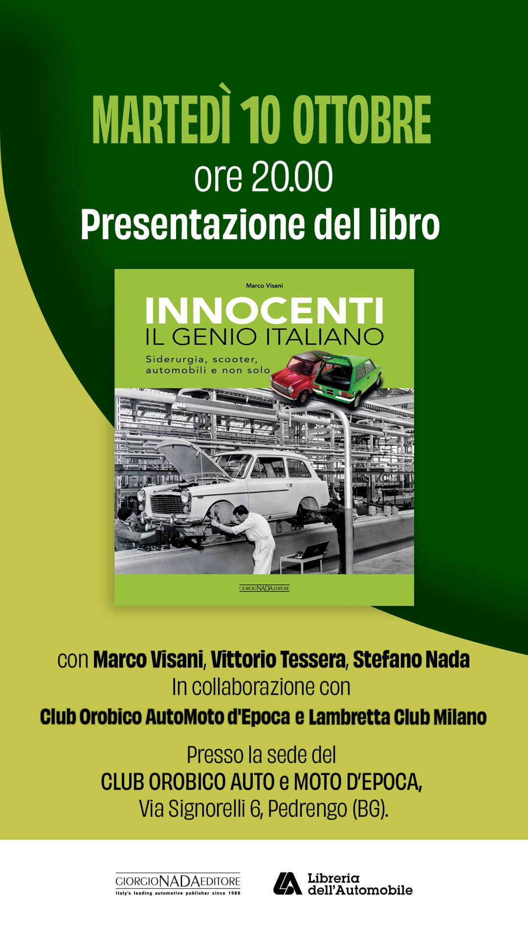 | presso il CLUB OROBICO Auto Moto d’Epcoa di Pedrengo (BG) CON: MARCO VISANI, giornalista e autore del libro VITTORIO TESSERA, Presidente On. Lambretta Club Milano STEFANO NADA, editore – Seguirà piccolo rinfresco – Ingresso libero anche ai non soci Si prega di confermare la partecipazione a: info@cluborobico.it |