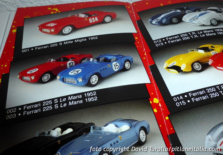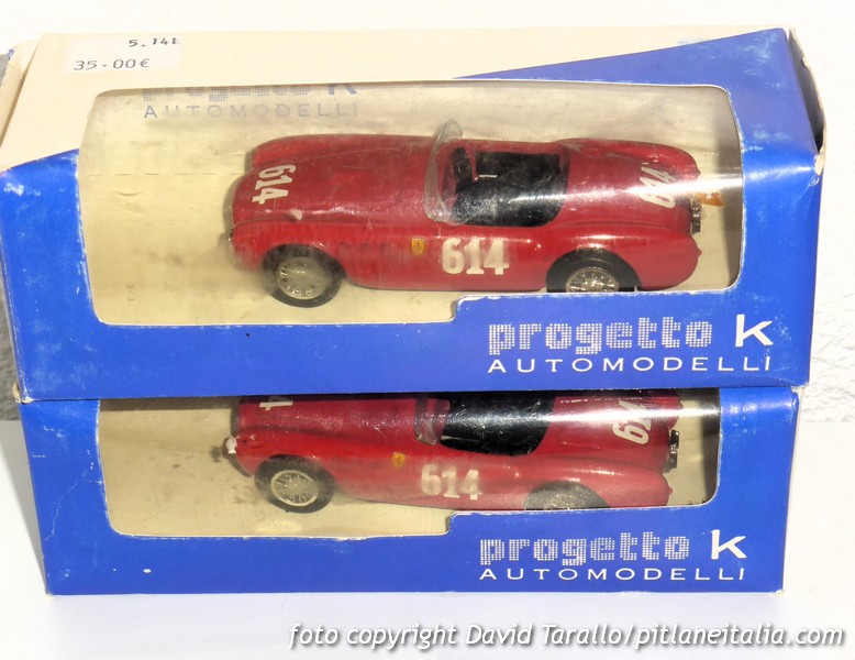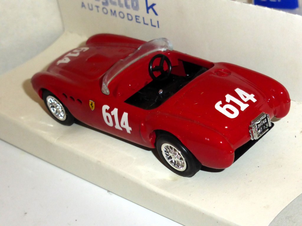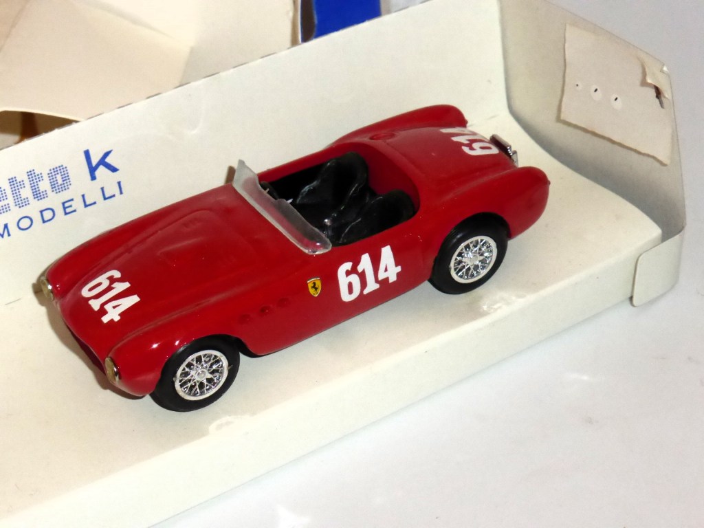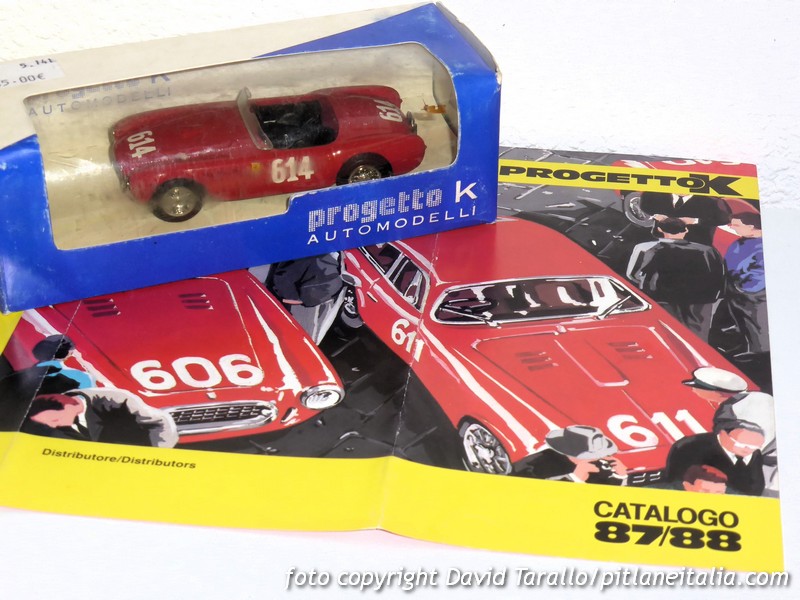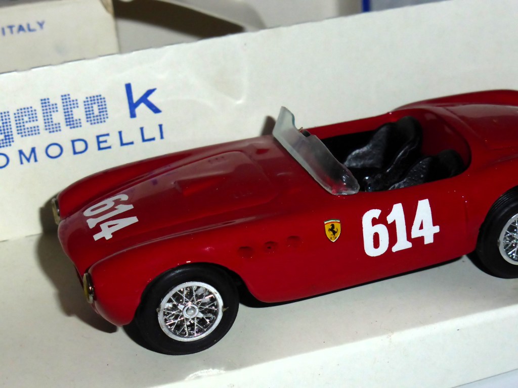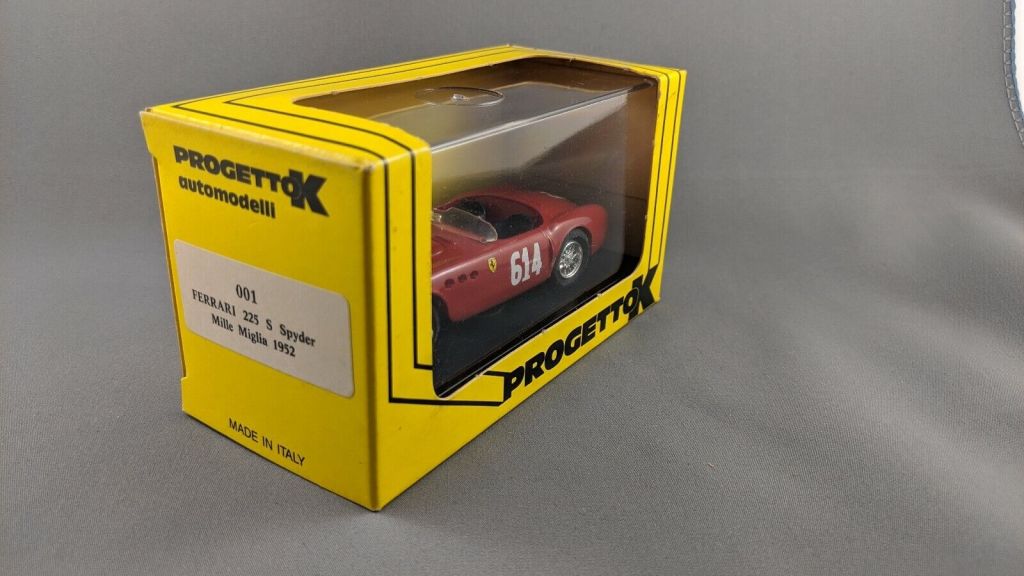 Per l’esordio della nuova gamma industriale Progetto K si decise che anche la carrozzeria sarebbe stata in plastica e non in zamak, rischiando di scontentare tutta una serie di collezionisti ai quali questa soluzione non sarebbe andata a genio, né allora né mai. Sia come sia, il primo modello, uscito nel 1987, fu la Ferrari 225 S Vignale, e la referenza 001 venne assegnata alla versione Mille Miglia 1952: in realtà la vettura col numero di gara 614, pilotata a Piero Taruffi, aveva un motore 4,1 litri da oltre 260 cavalli, derivato da quello della 340 di F.1 del 1950 e a rigore non avrebbe dovuto essere chiamata 225 S. A parte questo, il modello, nonostante inevitabili semplificazioni, si presentava piuttosto bene: finiture pulite, pochi pezzi sistemati bene, ruote a raggi in plastica cromate, pneumatici abbastanza fedeli. Gli interni erano molto sommari ma tutto sommato un modellista con un minimo di pratica avrebbe potuto facilmente renderli più che buoni.