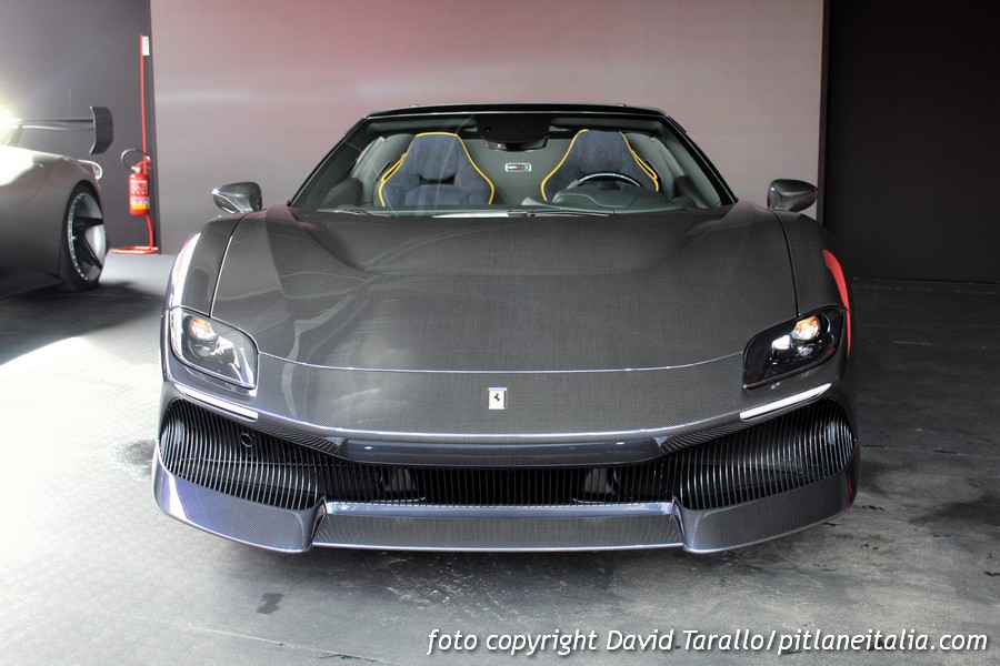 A livello di interni riveste particolare importanza la modifica della consolle centrale per alloggiarvi i comandi F1 introdotti nella gamma Ferrari dalla SF90 Stradale in poi. È stato così possibile aggiungere l’ormai iconico cancelletto, rendendosi necessario un suo adattamento alle modalità di funzionamento di questa vettura. Completano il quadro i sedili con specchiatura specifica in Alcantara® Blu Navy laserata ed accoppiata con tela ad effetto gradiente, nonché i tappeti in tessuto twill specifico con effetto cangiante.