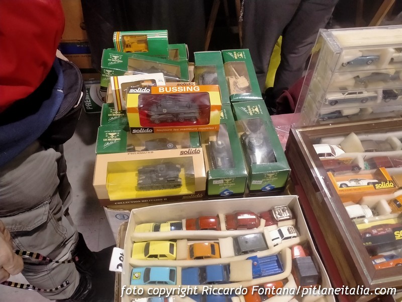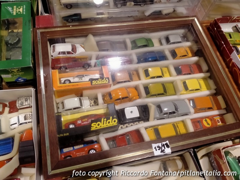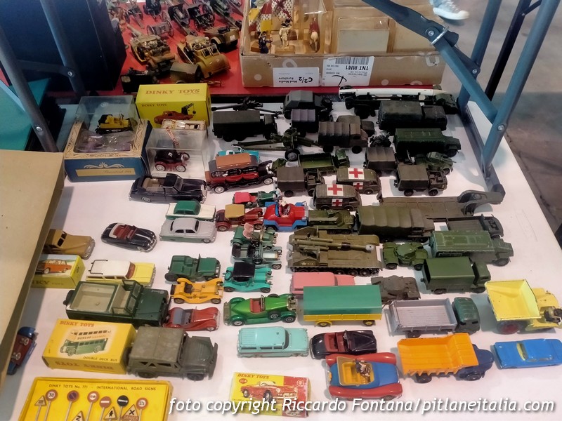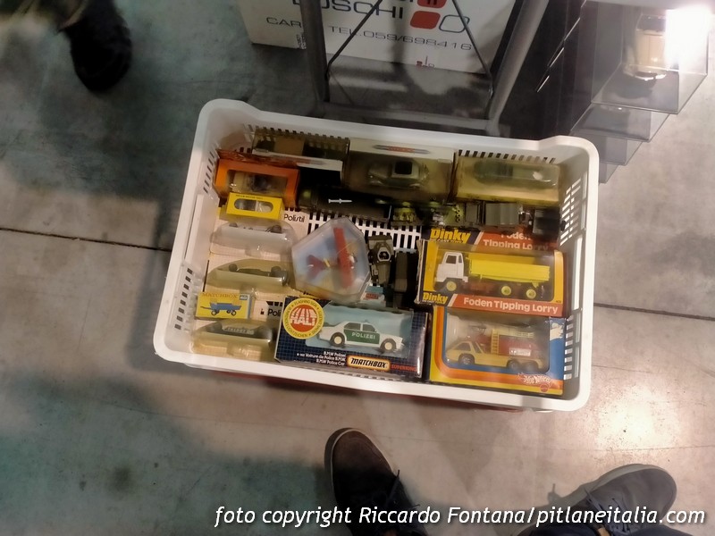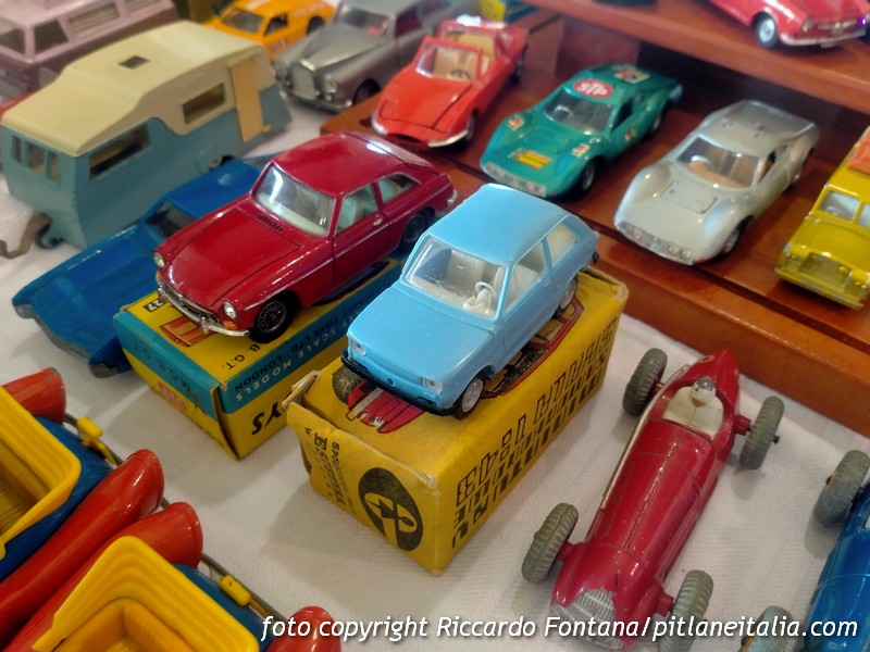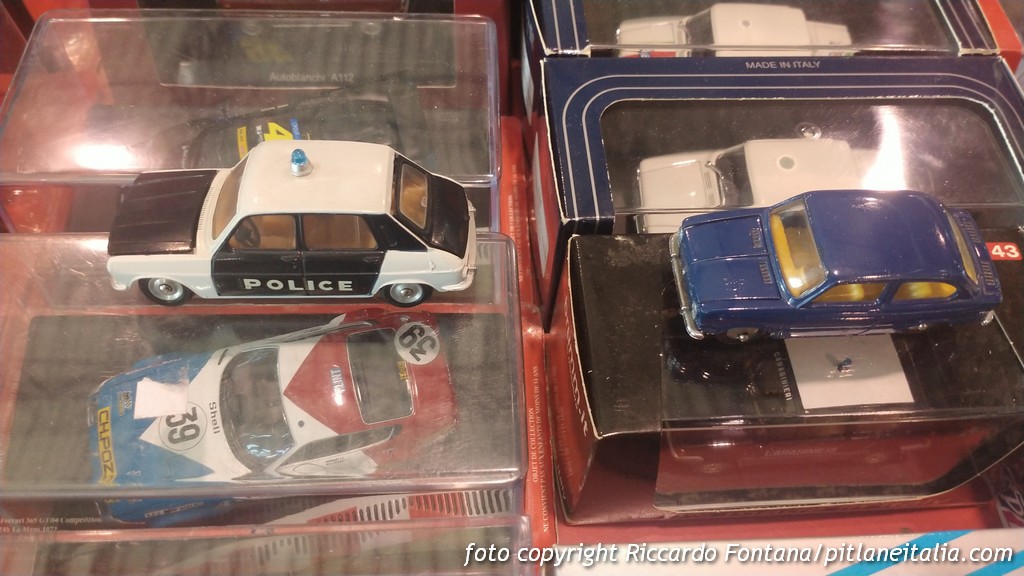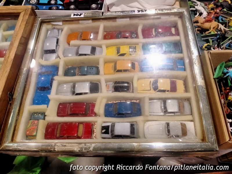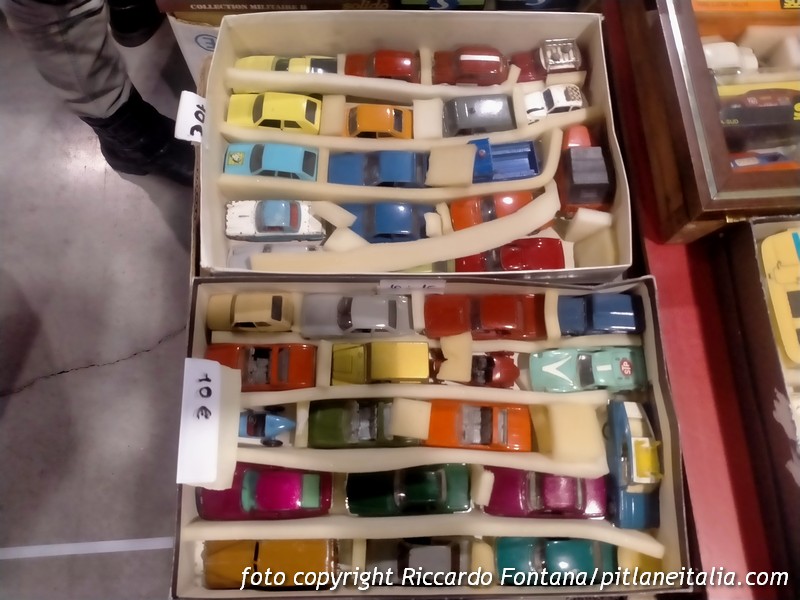 Un consiglio che – ancora una volta – ci sentiamo di dare, è quello di stare molto attenti a dove si guarda, senza mai trascurare gli anfratti più defilati ed improbabili: in una cassetta della frutta sotto ad un banco nella prima fila vicina all’entrata, perfettamente mimetizzate in mezzo ad un gruppo di edicolosi, sono sbucate una bellissima Fiat 850 Berlina di Mercury in un bel blu scuro ed una Simca 1100 in livrea Police, una Dinky Toys France prodotta in Spagna, proposte a cifre ragionevolissime (super senza scatola) soprattutto in relazione alle condizioni in cui si presentavano, invero ottime.