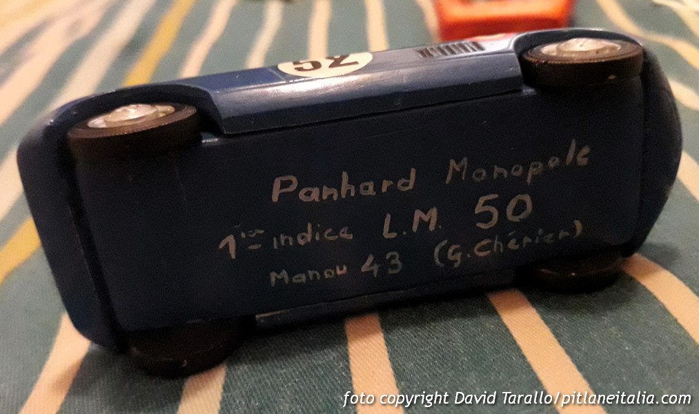Le Mans 43 era stato marchio di kit in resina molto semplici e commercializzati senza decals, attivo dal 1976, realizzati nell’ambito della produzione Manou di Jacques Simonet. Erano usciti diversi soggetti, fra cui alcune Monopole Panhard che vedete in apertura. Qui sotto, due immagini recenti del modello della numero 50, fotografato su MA Collection quasi quarant’anni fa. Sul fondino è riportata la dizione “Manou 43”. La firma (G. Chérier) è quella del creatore del master.