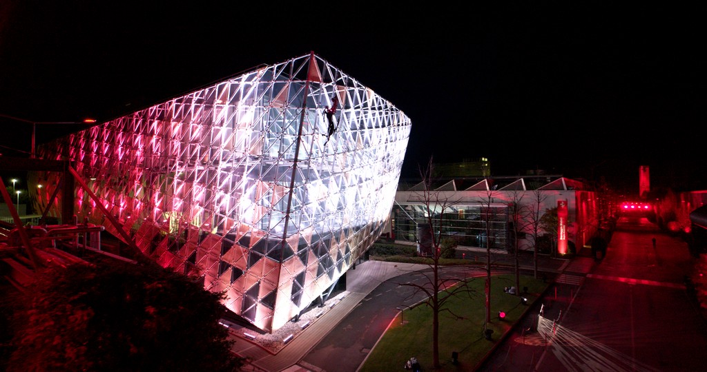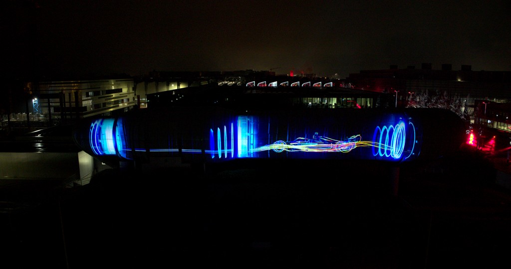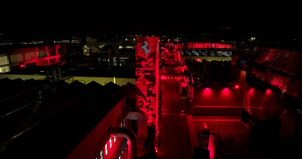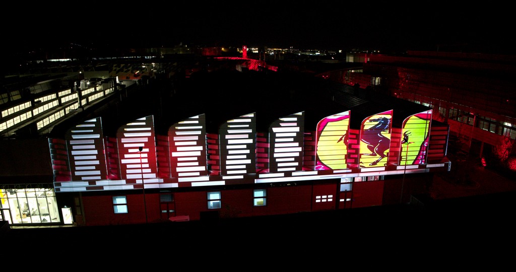 Alcuni degli edifici più iconici del campus hanno fatto da sfondo a delle proiezioni luminose che raccontano l’unicità di un’azienda composta da oltre 5.000 persone. Lo show è animato per oltre un chilometro lungo il viale Enzo Ferrari da immagini tridimensionali e architetture luminose create con più di 400 elementi tra teste mobili, proiettori, barre led ed effetti laser, ricorrendo a tecnologie di ultima generazione e a basso consumo energetico.