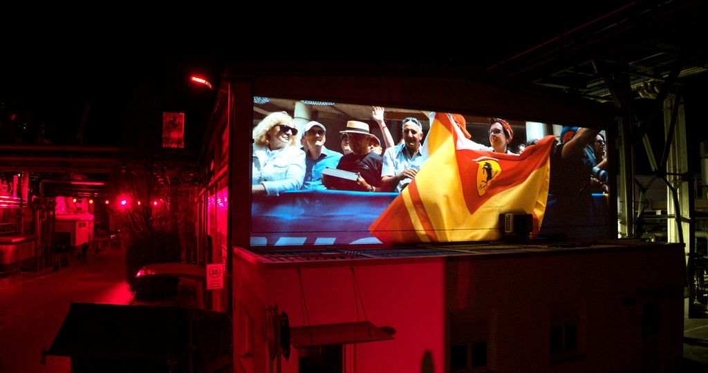 Sull’arco di mattoni che incornicia l’ingresso storico vengono proiettati i video di alcune delle automobili che lo hanno attraversato nel corso degli anni: dalla 125 S, che proprio qui ha fatto il suo debutto nel 1947 dando il via a una serie straordinaria di modelli, alle due 499P portate in trionfo lo scorso giugno dai vincitori della 24 Ore di Le Mans.