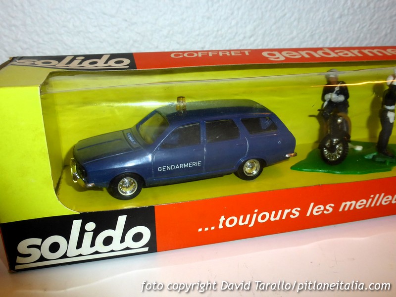 La prima confezione di questo nuovo corso fu un insieme a tema Gendarmerie, con una Renault R12 Break blu, la moto BSA (si faceva con quello che c’era), due figurine di gendarmi di produzione Starlux e – udite udite – un bel radar tipo Mesta 206 nascosto dietro un cespuglio, probabilmente la prima comparsa in assoluto di questi malefici attrezzi nella storia del modellismo. Non si può dire che Solido non cercasse di precorrere i tempi! Il set, uscito nel 1975-76, è noto in due varianti minori: nella prima, l’antenna della moto, infilata in un apposito foro accanto alla sella, è nera e abbastanza lunga; nella seconda è grigia ed è stampata in corpo unico con la sella stessa. Su alcune R12 (forse della produzione più tarda?) la scritta in decal ad acqua Gendarmerie compare solo sulla portiera sinistra, ossia il lato visibile nella presentazione. I fari erano dipinti, come d’abitudine nelle R12 Solido prima serie, quella in produzione fino al 1977. La confezione riprende la classica grafica con i colori Solido tipici dell’epoca: rosso e giallo col rhodoid trasparente su due lati e il logo della marca bianco in campo nero.