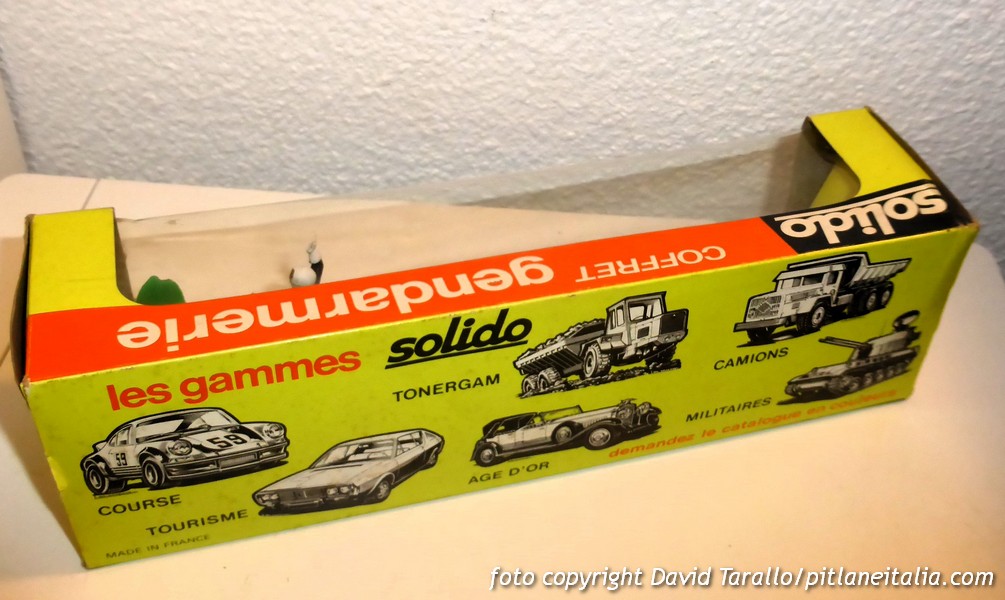 Questi coffret non saranno rarissimi ma la vera difficoltà consiste nel trovarli in condizioni perfette, con la scatola intatta e tutti gli accessori. I modelli erano fissati alla base mediante dei fermi in plastica nera a forma di doppia freccia, che si perdono abbastanza facilmente se il cartone è indebolito per l’umidità o per l’usura, cosa tutt’altro che improbabile. Il gendarme sulla moto era tenuto in posizione da un elastico.