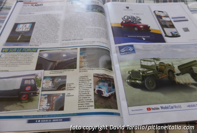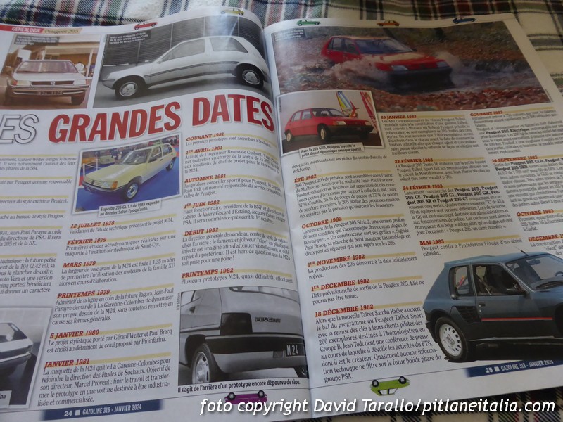Il numero di gennaio 2024 presenta un’approfondita analisi su tutta la carriera della Peugeot 205; certo, non un argomento originalissimo, che in Francia è stato tra l’altro oggetto di due o tre Hors Série molto ben fatti, usciti di recente, ma per chi voglia spendere poco (Gazoline costa € 4,95) costituisce comunque una buona fonte di informazioni, anzi ottima, visto che si ripercorre l’intera storia del modello, dai primi bozzetti fino alle ultime versioni, senza dimenticare le vetture da competizione.