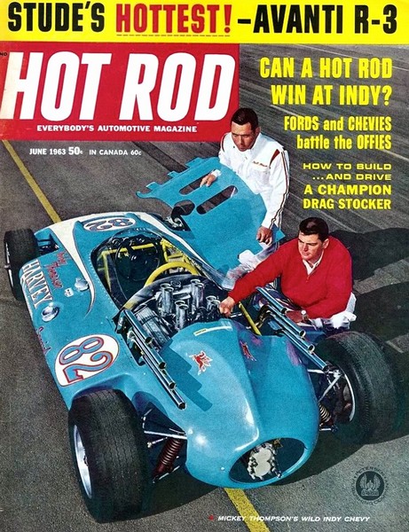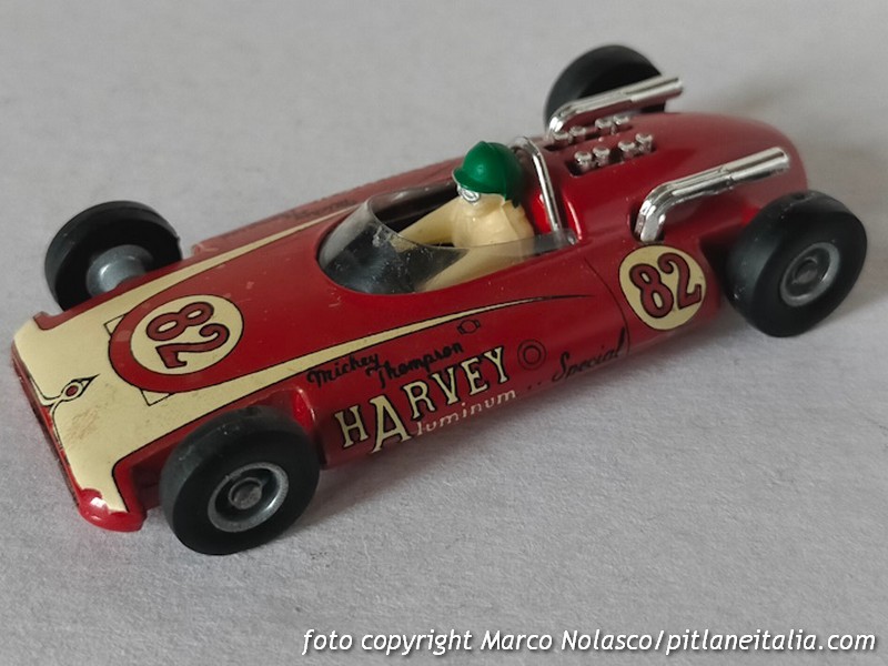 Il primo è un Solido della serie 100, precisamente il n.138 del 1965 che riproduce la M.T. (Mickey Thompson) Harvey Aluminium Special Chevrolet che Bill Krause non qualificò alla 500 Miglia di Indianapolis del 1963. Come è noto il modellino esiste anche in azzurro ed è questa la tinta corretta. Rossa era invece la vettura n. 83 di Duane Carter.