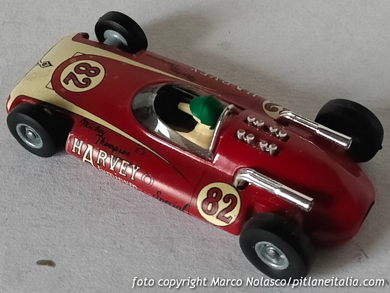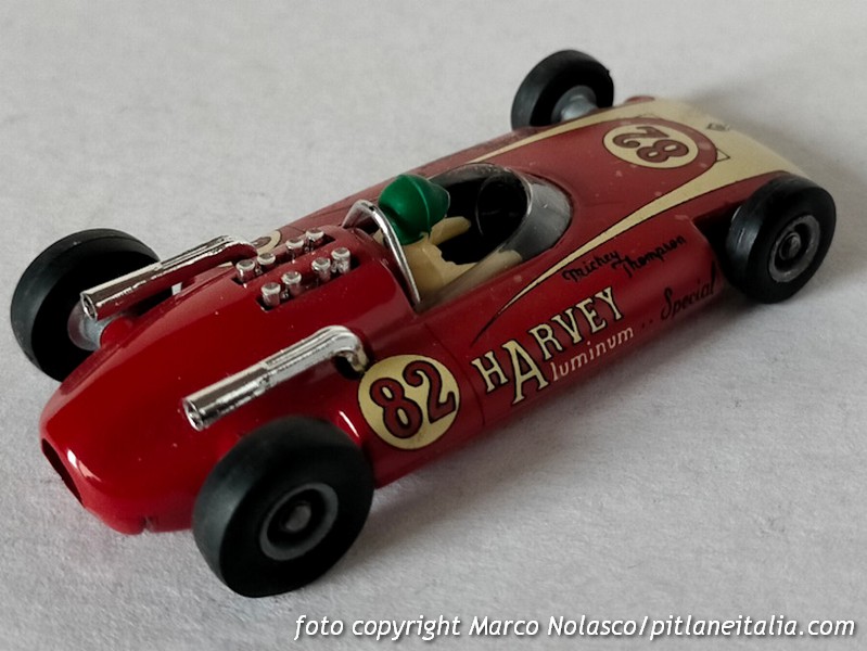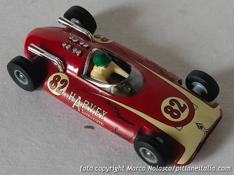 Il secondo è appunto una formula 1 Politoys, il n. 63 del 1964. Molti, compreso il sottoscritto, hanno pensato per decenni che questo modello, denominato H.A.S. F1, fosse di fantasia, infatti nessuna H.A.S. ha mai partecipato al mondiale piloti, ma in realtà, come insegna il bellissimo sito “Quelli della Polistil”, riproduce una vettura esistente, ancora una Harvey Aluminium Special, appunto H.A.S.; diversamente del Solido questo modello si riferisce, credo, alla versione del 1962 con motore Buick.