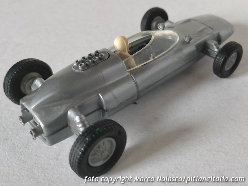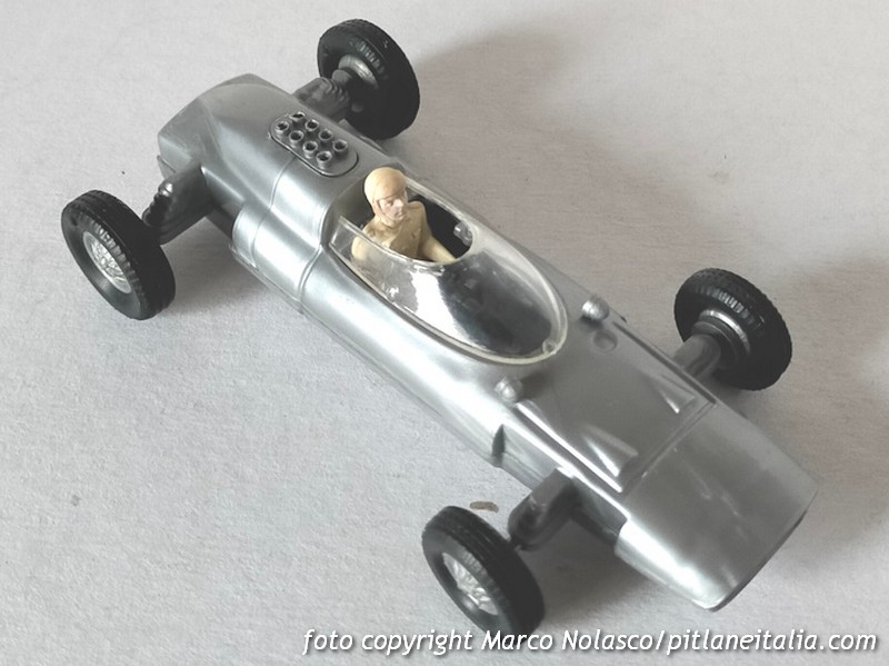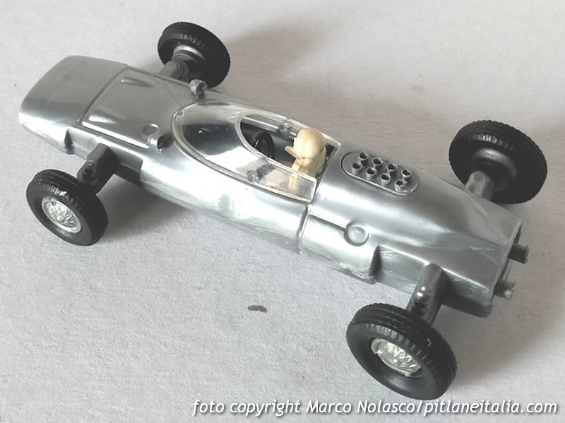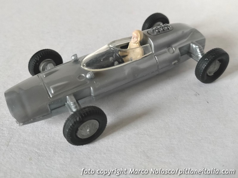 Mentre il Solido, colore a parte, è fedele e in vera scala 1/43, come si deduce dalla quota del passo che spero si intraveda nel disegno che allego, il Politoys è un vero e proprio giocattolo che, ricordo, correva velocissimo e stabile sul pavimento, ma che richiama solo a grandi linee la vettura reale. Inoltre, tenendo per buono il passo della versione del 1963, la scala, dichiarata 1/41, è in realtà intorno all’ 1/34. D’altronde la serie delle monoposto, tutte formula 1 meno questa, la Porsche F2 e la De Sanctis F3, era la più economica e giocattolesca del catalogo Politoys. A suo favore solo la presenza dei retrovisori, anche se in posizione approssimativa e, a parer mio, i tratti più convincenti del pilotino.