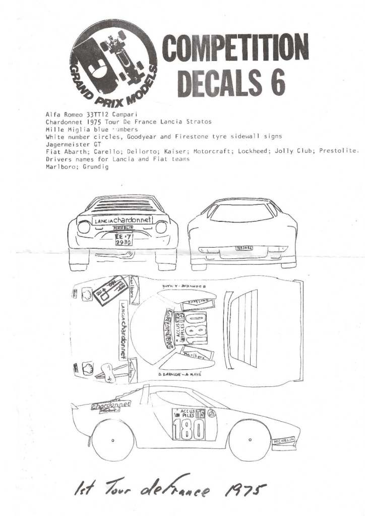La ricerca nella memoria non dura a lungo. Mi torna in mente uno di quei foglietti di Grand Prix Models, la decal Competition 6, che permetteva di ottenere la Stratos rossa di Darniche. All’epoca GPM aveva prodotto anche un’altra decal per la Stratos di Solido, la Harper’s Bazaar. Quella a strisce, di grande effetto.